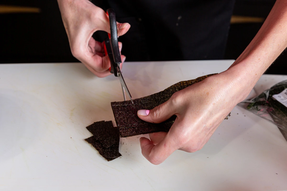 Измельчите нори на небольшие полоски, авокадо — на мелкие кубики и полейте соком лимона.