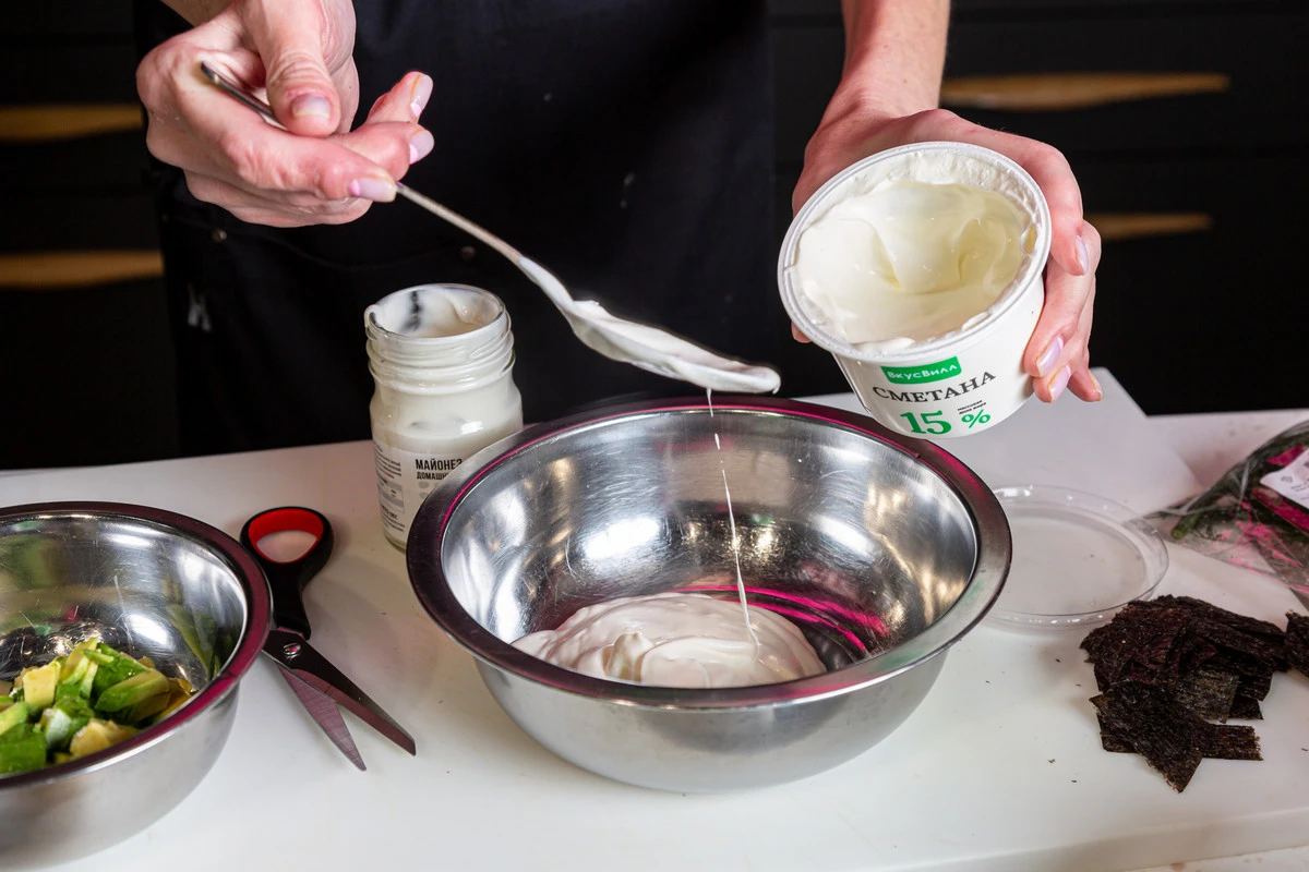 Для соуса смешайте майонез и сметану, добавьте перец.