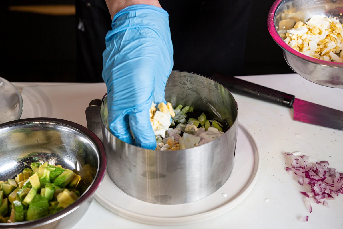 С помощью кулинарного кольца выложите салат слоями: рис, соус, нори, огурцы, соус, яйцо, лук, рыба, соус, авокадо, рис, соус, икра. Подавать салат можно сразу же, украсив веточками укропа.