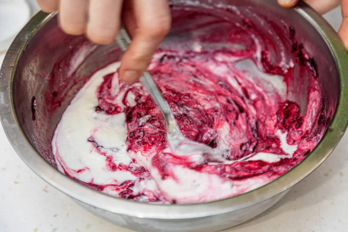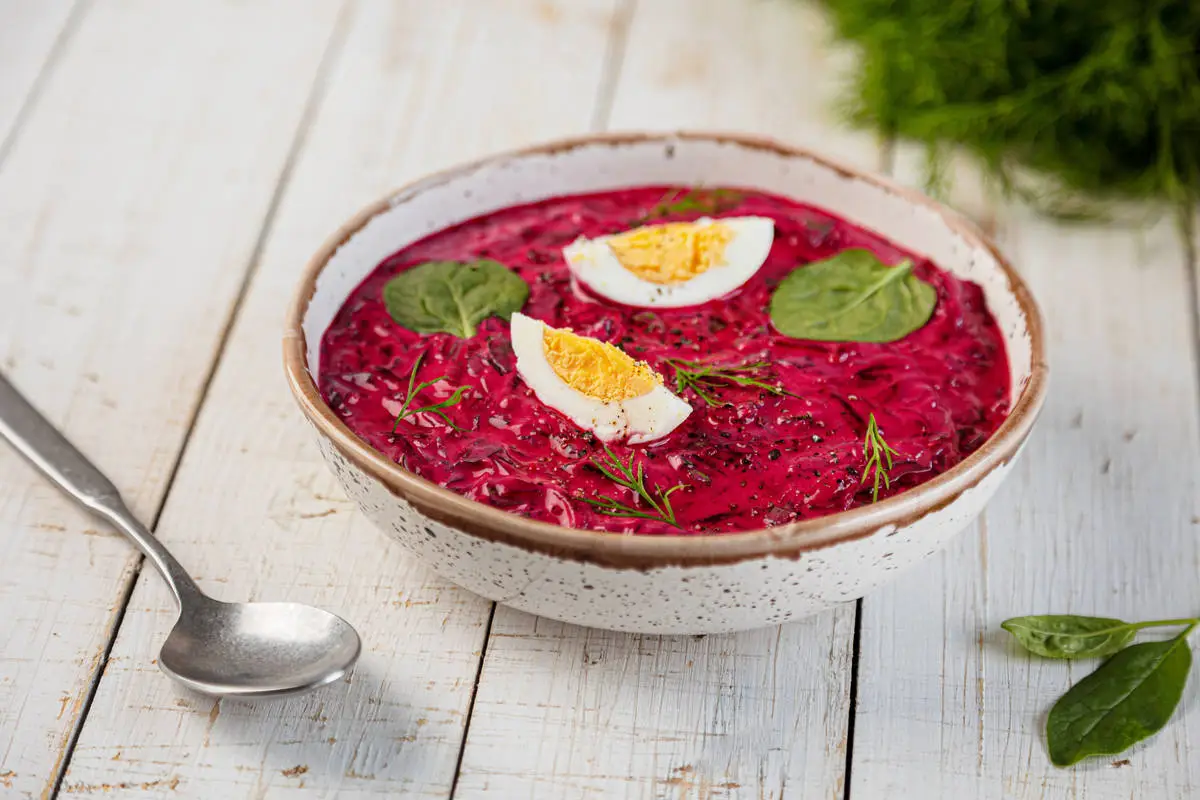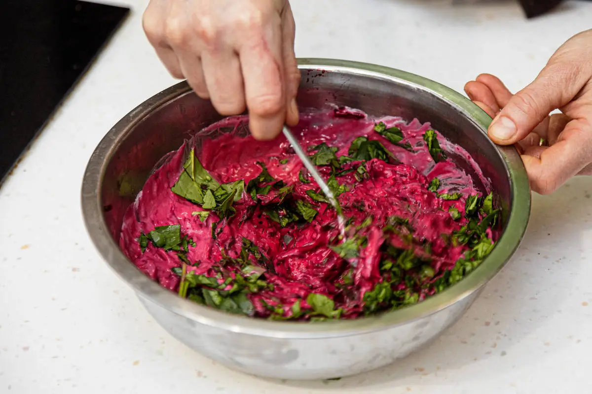 Свёклу измельчите на крупной тёрке, соедините с мацони и водой, перемешайте.