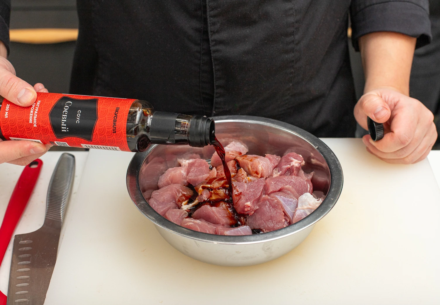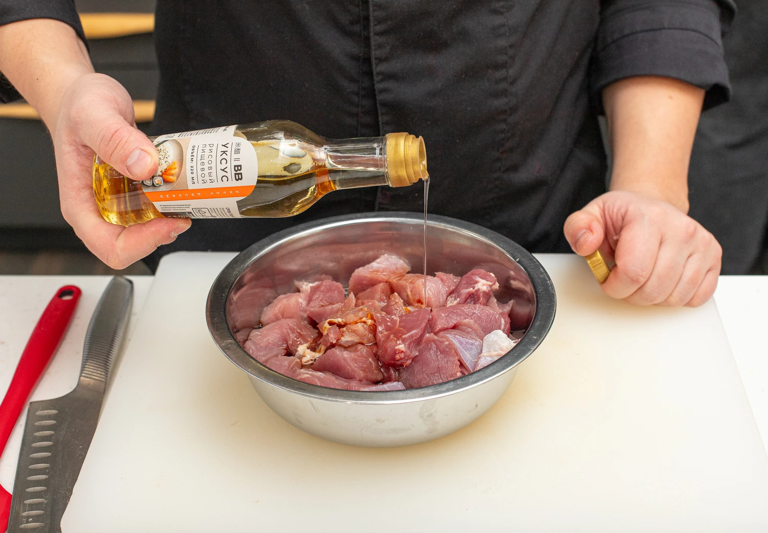 Смешайте кукурузный крахмал с водой, соевым соусом, солью и рисовым уксусом.