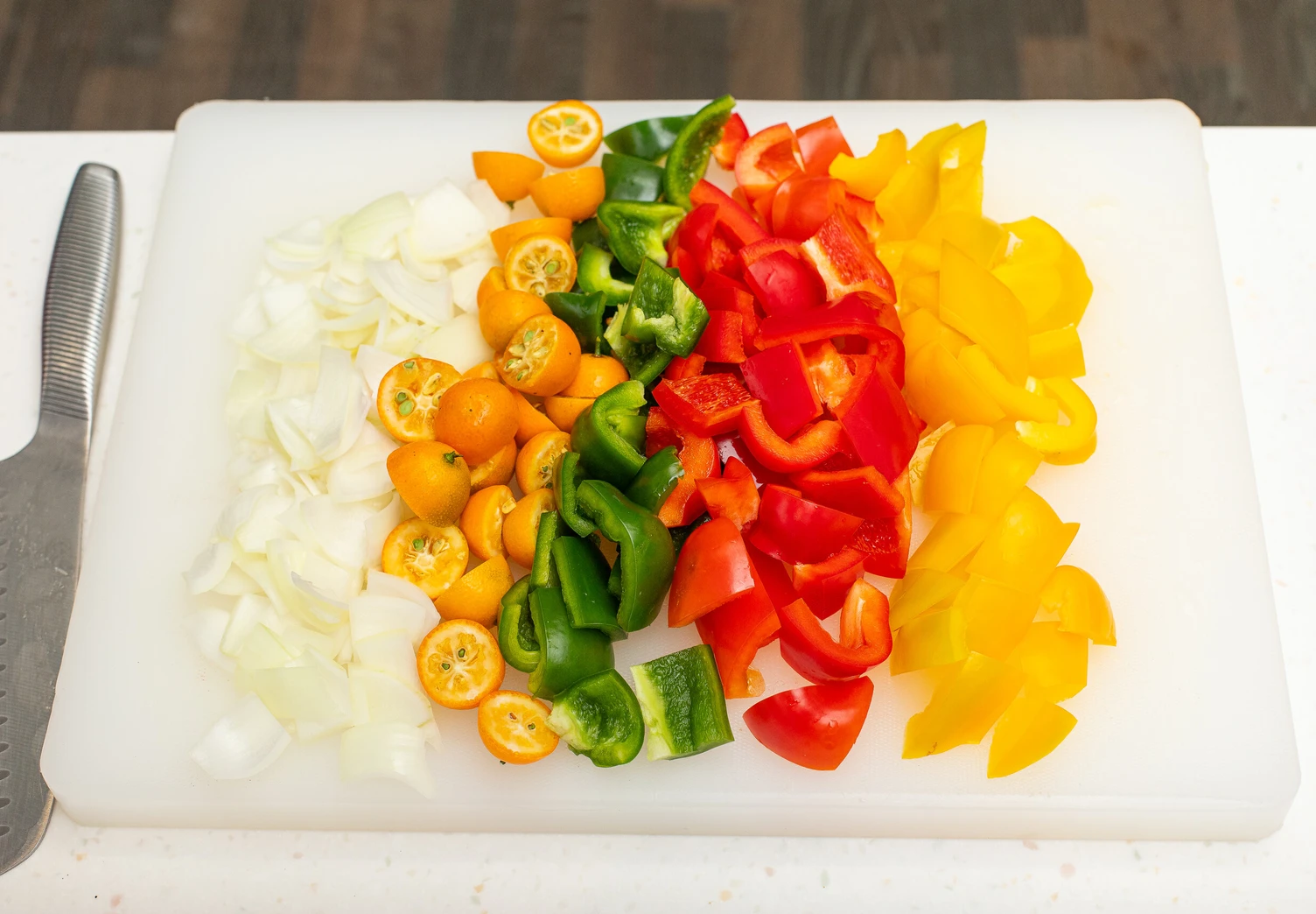 Порубите перцы и лук крупным кубиком, а кумкват разрежьте пополам поперёк.