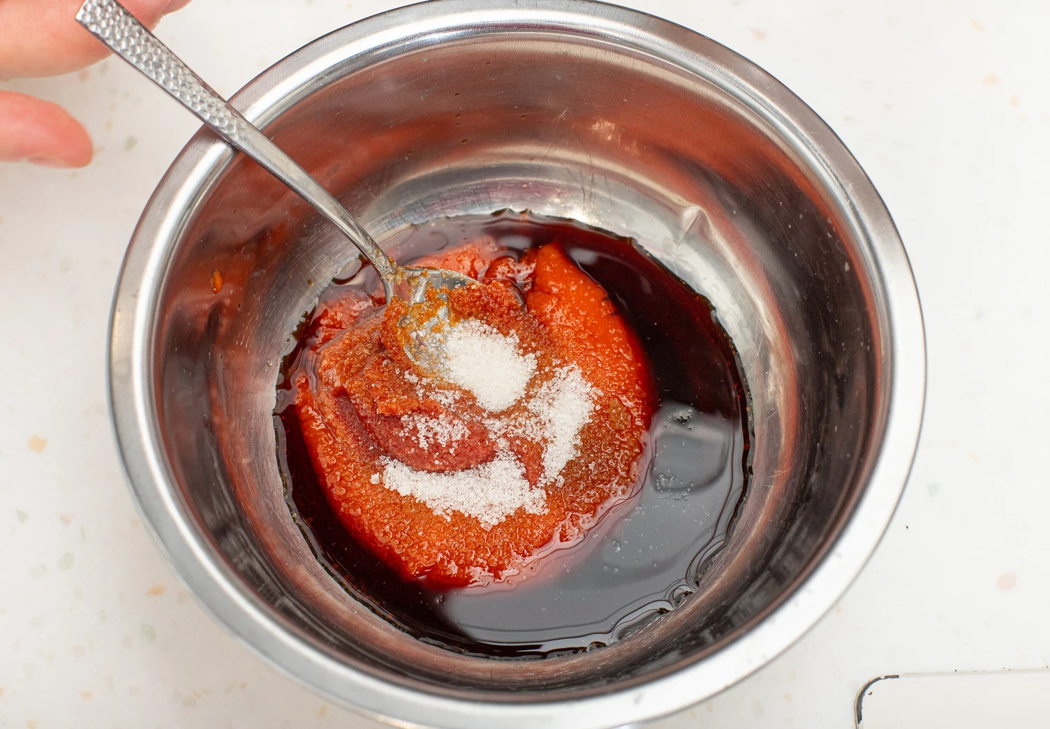 Отдельно смешайте томатную пасту, сахар, соус шрирача и немного воды.