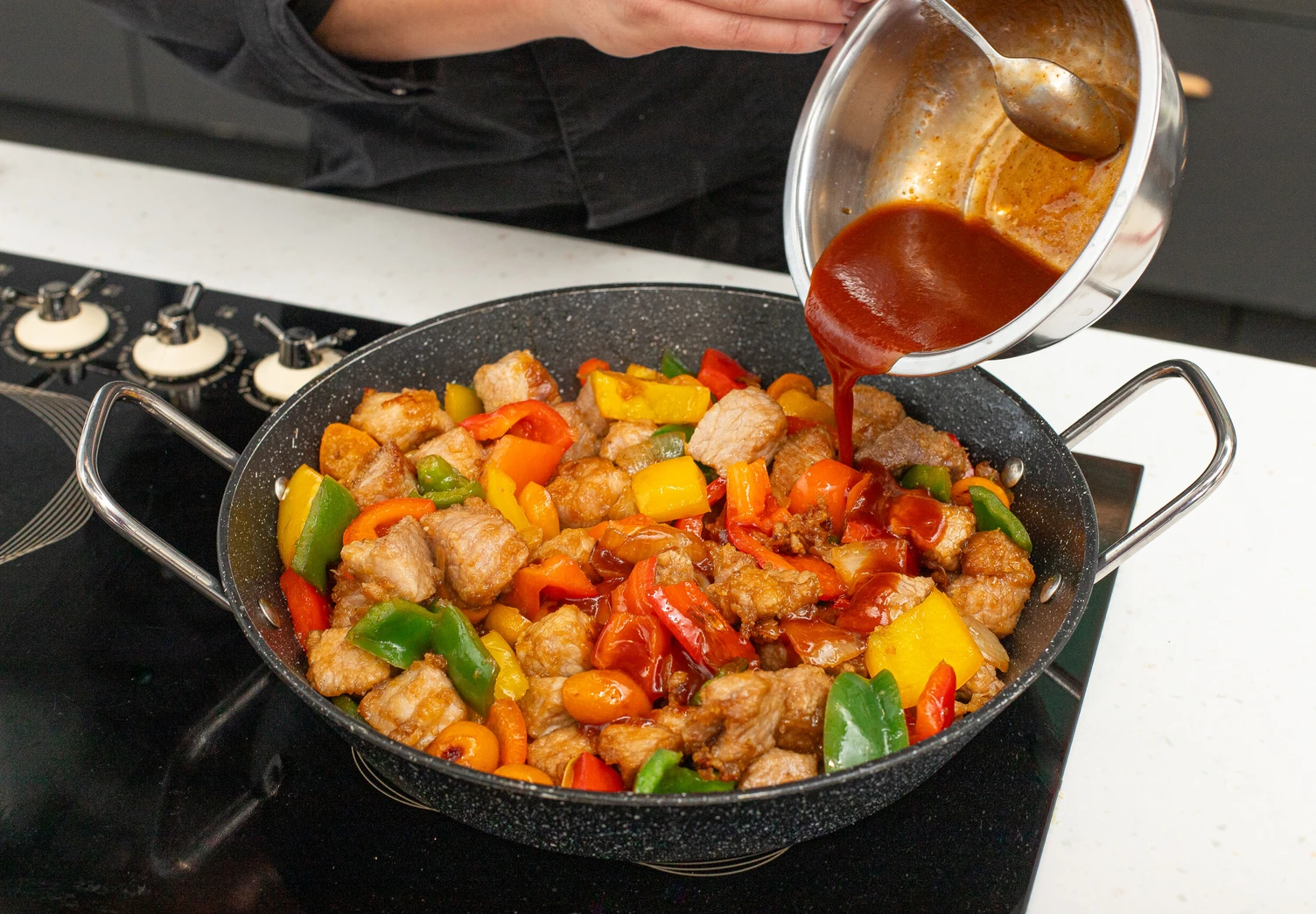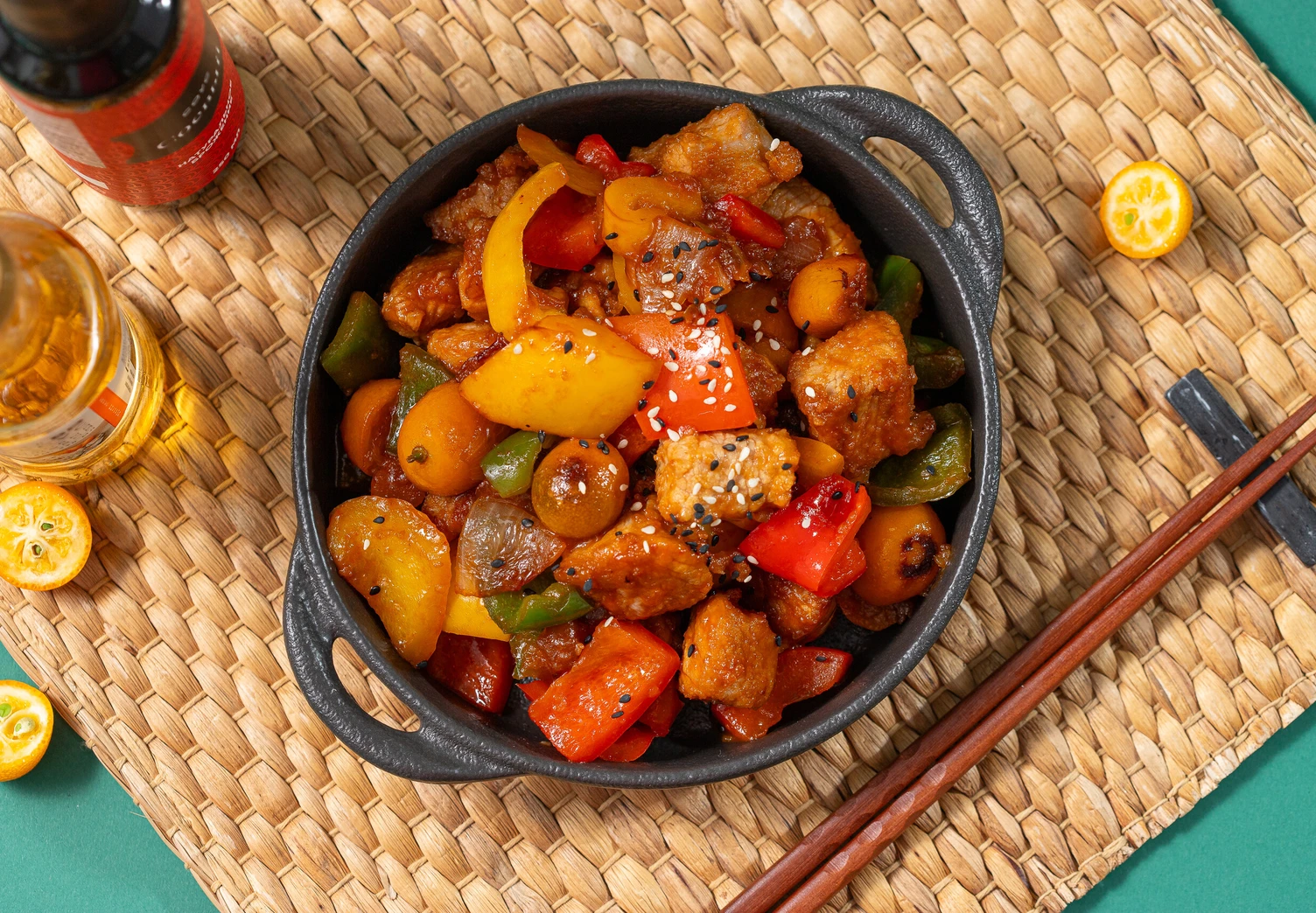 Свинина в кляре с кисло-сладким соусом — одно из самых популярных в нашей стране блюд китайской кухни. Вместо положенных по оригинальному рецепту ананасов мы использовали кумкваты, и они отлично здесь прижились.