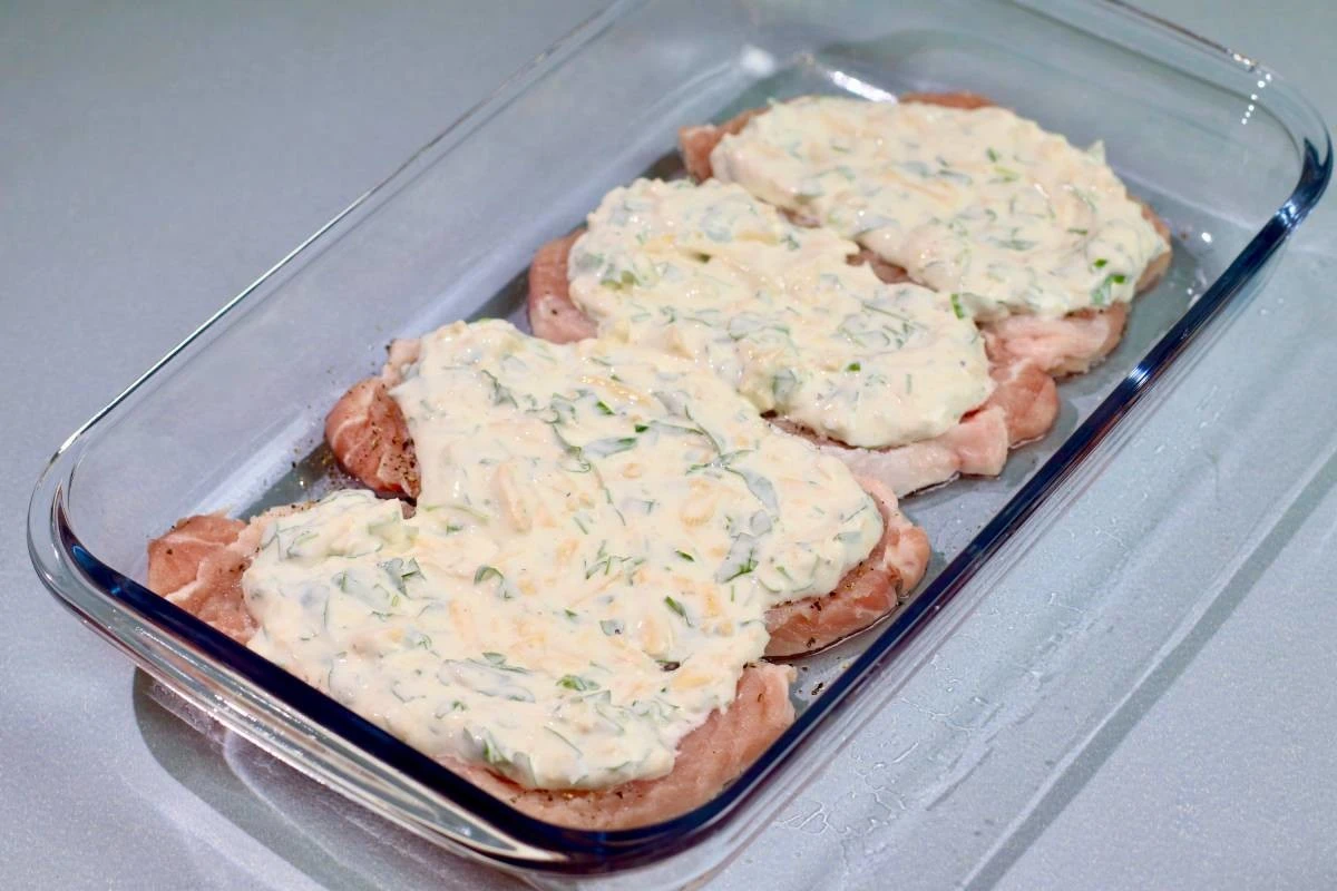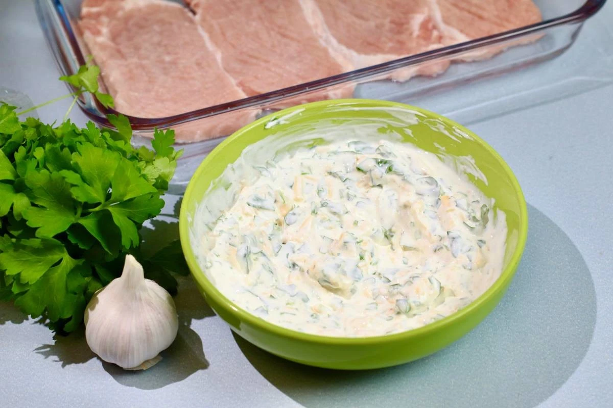 Смешайте сметану, измельчённый чеснок и зелень и 100 г сыра, натёртого на крупной тёрке.