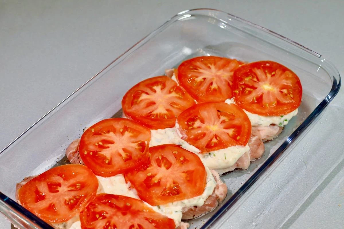 Нарежьте помидоры кружками и выложите поверх соуса.