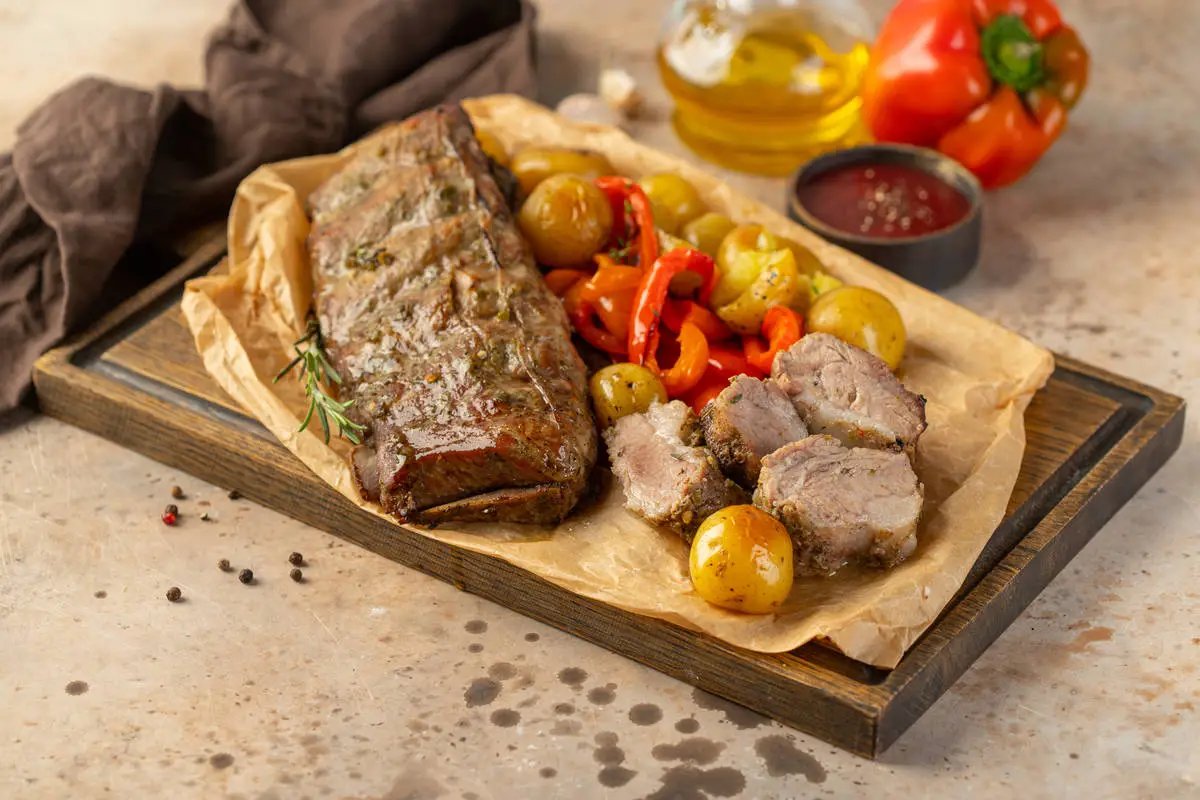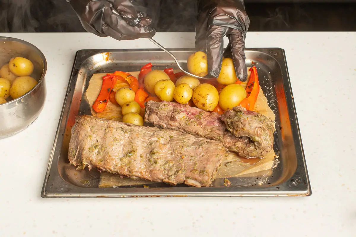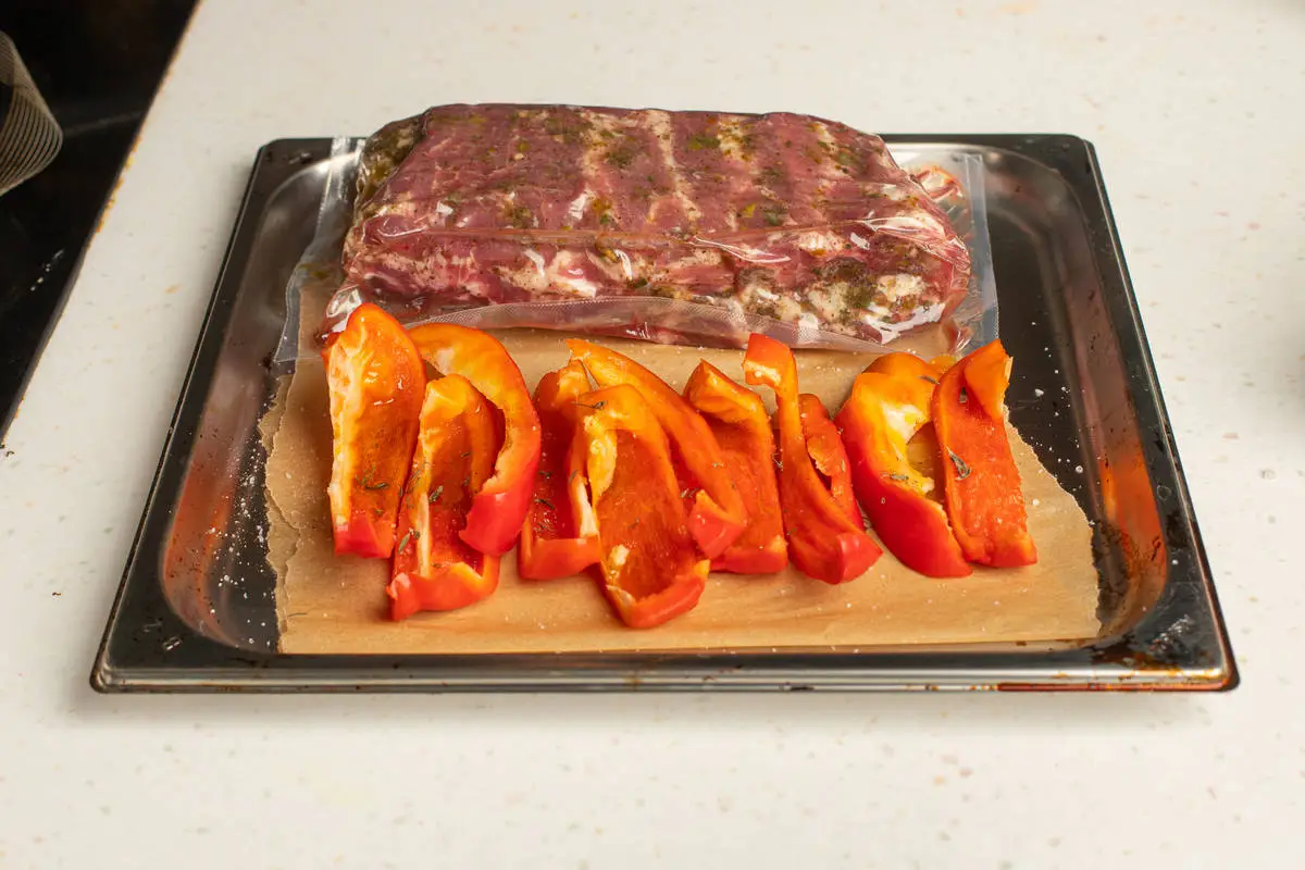 С упаковки с рёбрами уберите бумажные этикетки. Положите мясо запекаться при 200 °C примерно на 45 минут. Сладкий перец нарежьте сегментами, положите на противень и запекайте одновременно с мясом.