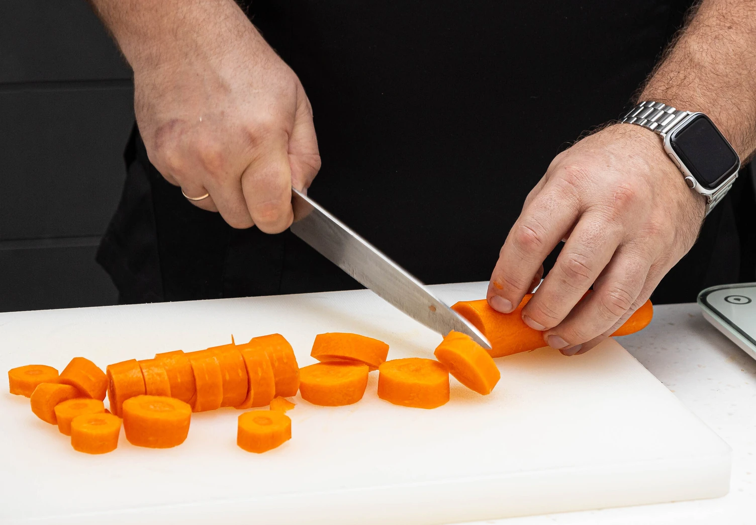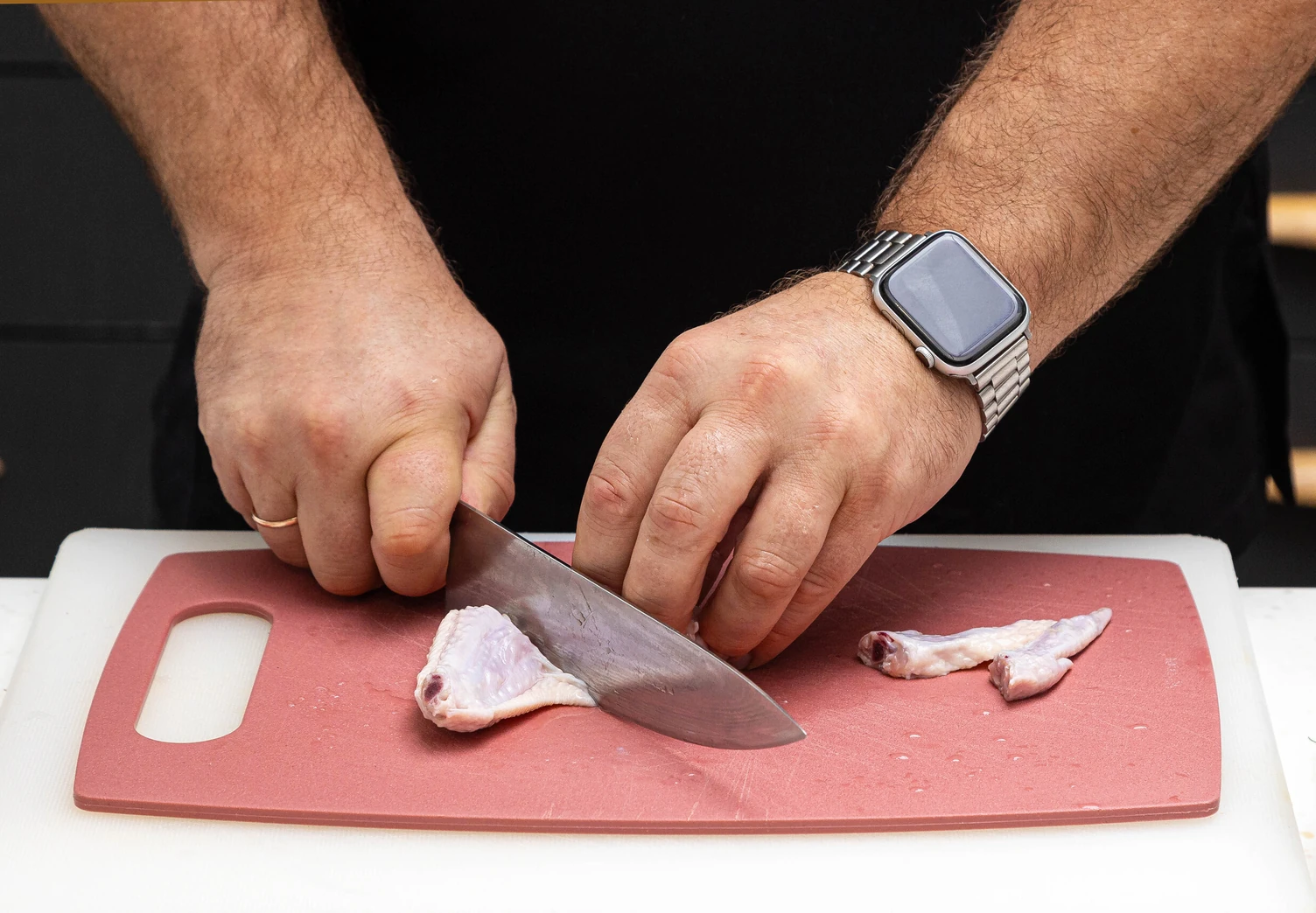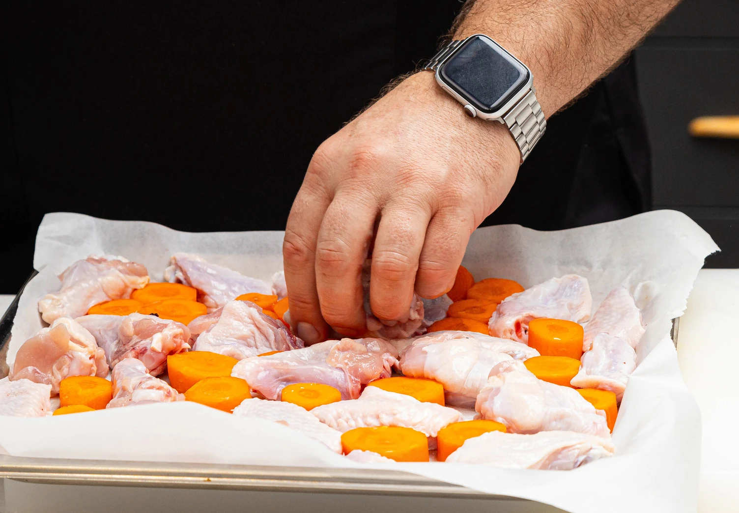 Разложите крылья и морковь на противне, застеленном пергаментом, и запекайте в духовке при 200°С в течение 30 минут.