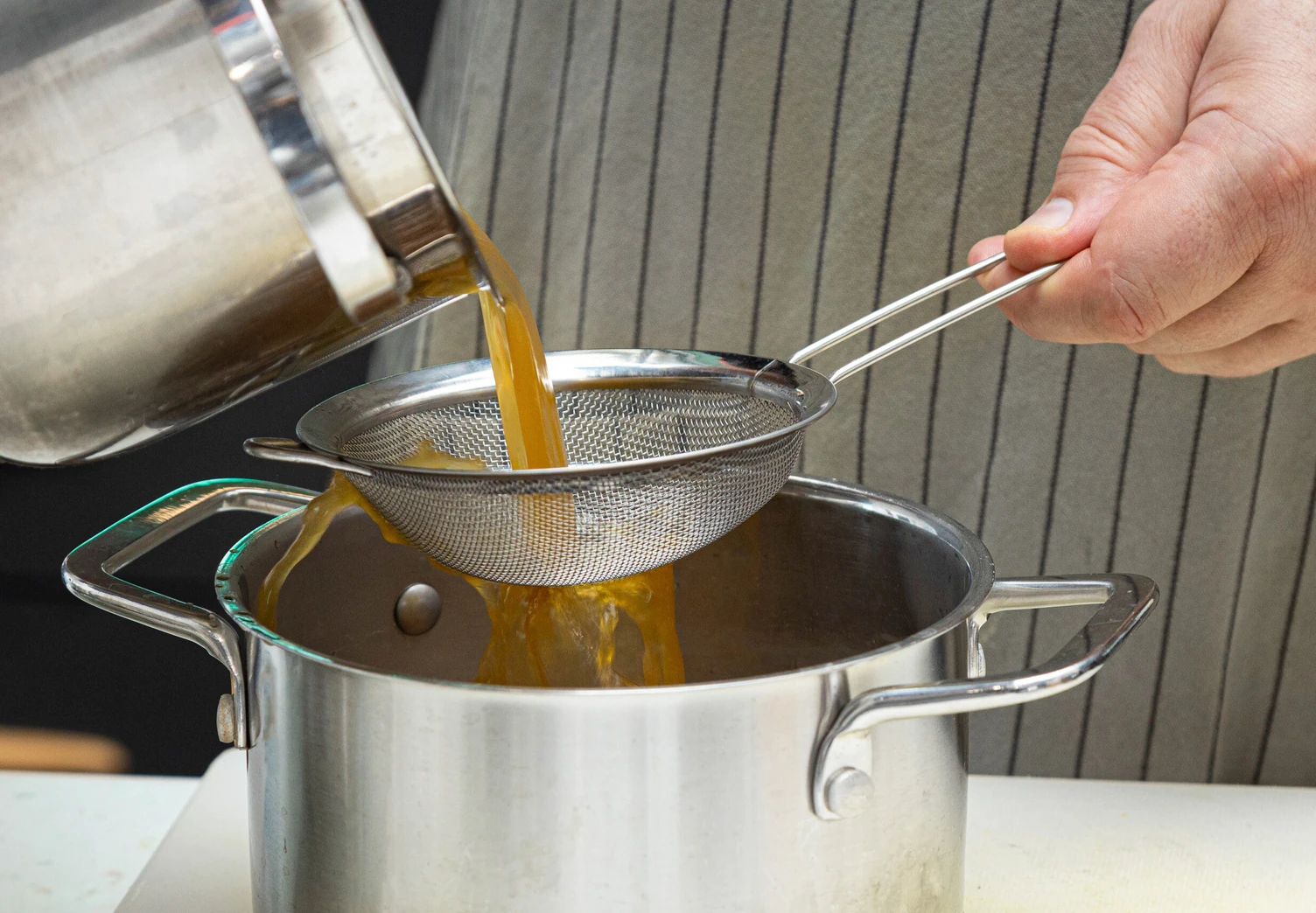 Когда бульон будет готов, выньте из него грибы шиитаке и отложите их. Затем процедите весь бульон.