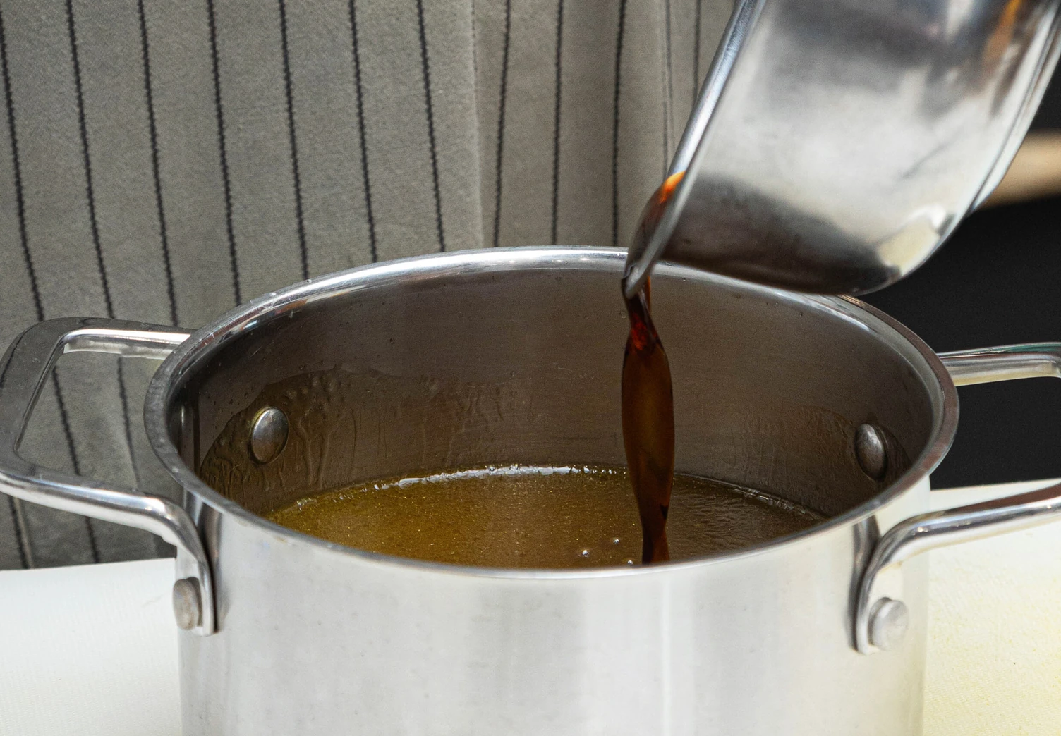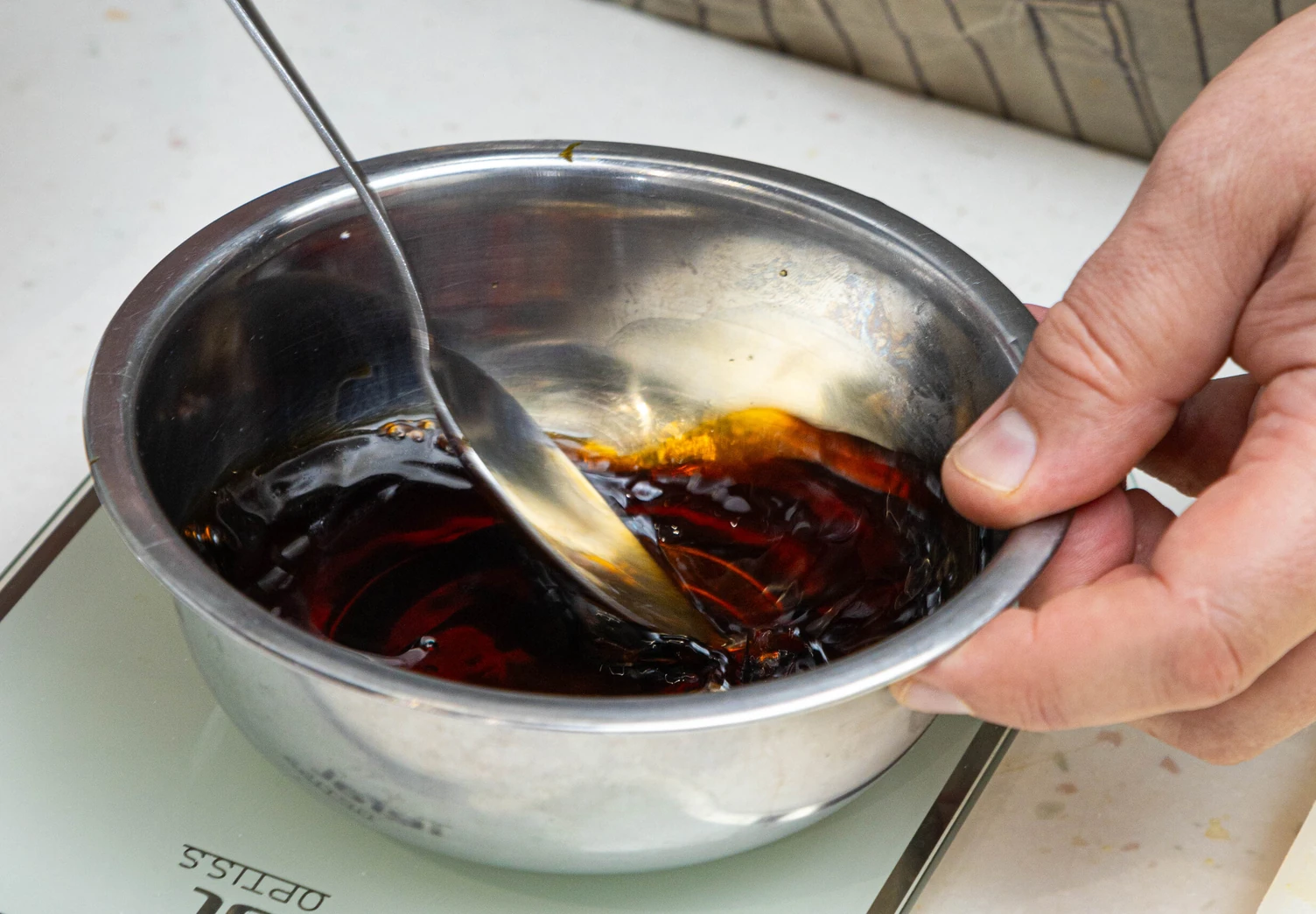 Смешайте мирин и оставшийся соевый соус для заправки.
