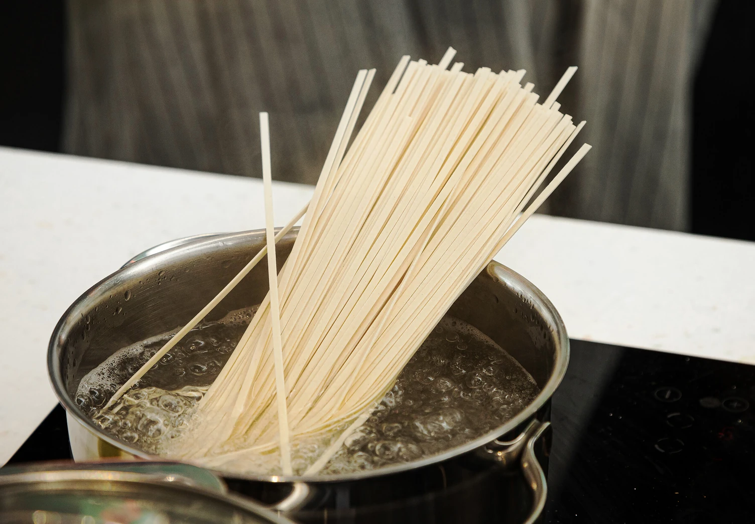 Сварите яйца всмятку, опустив их в кипящую воду на 6 минут. Отдельно приготовьте лапшу по инструкции на упаковке.