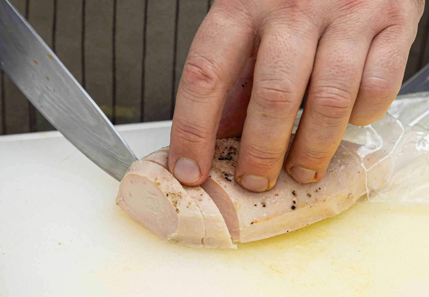 Нарежьте оставшийся зелёный лук, отложенные грибы шиитаке и куриную грудку.
