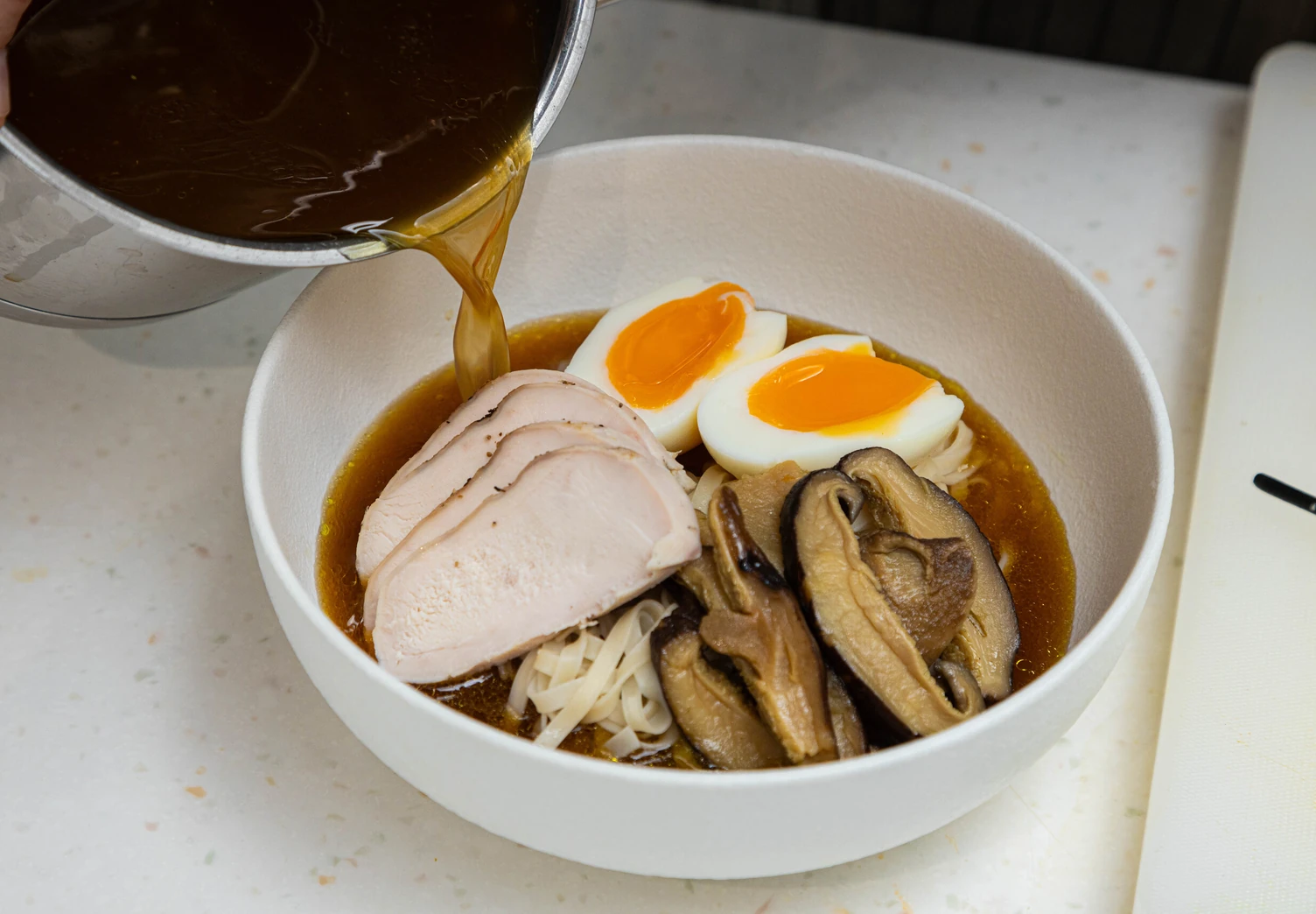В основе этого японского супа — ароматный бульон из овощей, грибов и специй, который можно приготовить заранее и хранить в холодильнике несколько дней. А перед подачей останется только собрать ваш идеальный рамен: добавить куриную грудку, отварное яйцо, лапшу или даже готовые гёдза. Быстро, сытно и вкусно!