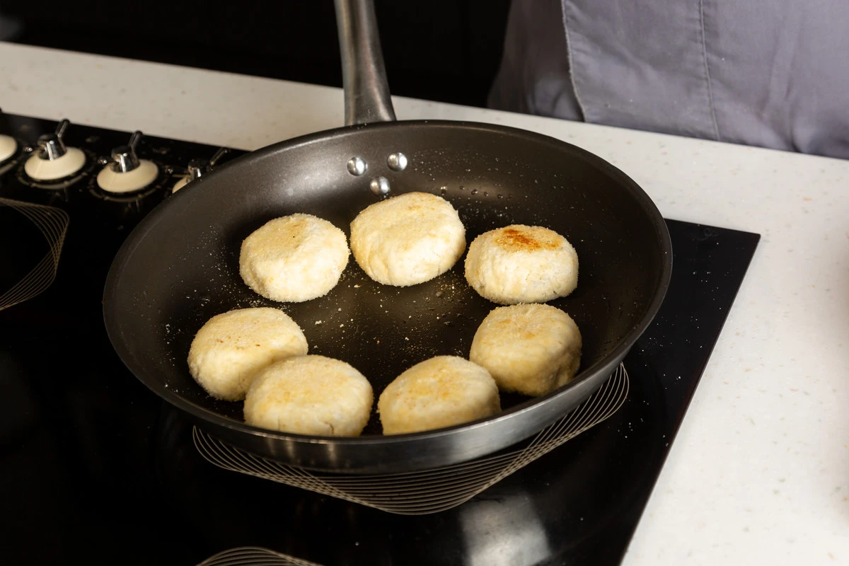 Сформируйте из теста сырники, обваляйте в кокосовой муке и жарьте на смазанной маслом сковороде до золотистого цвета.