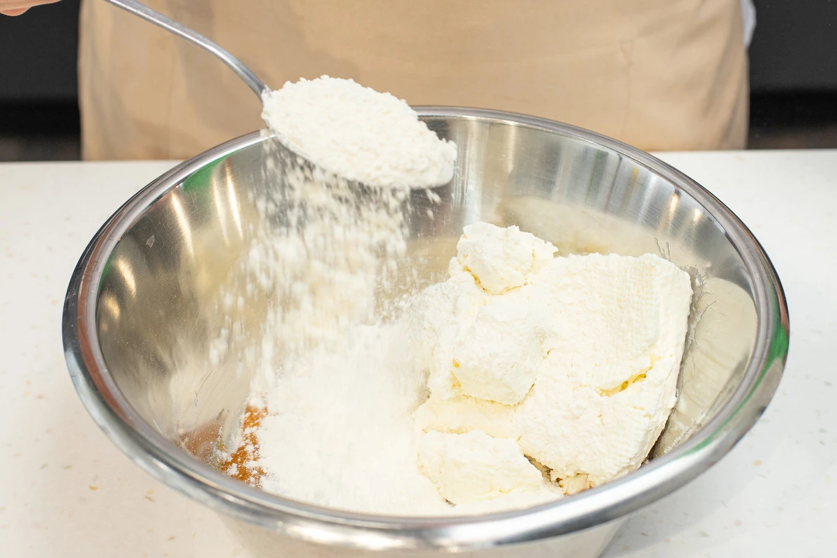 К яичным желткам добавьте сахар, соль и перемешайте венчиком (взбивать не нужно). Добавьте творог, 2 ст. ложки муки и разотрите ложкой до однородности. Разделите «тесто» на четыре части.