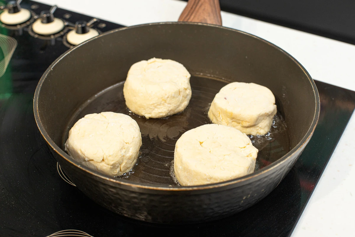Выложите сырники на сковороду с маслом и готовьте на среднем огне примерно по 7 минут с каждой стороны.