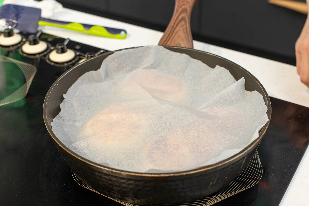Вырежьте из пергамента круг по диаметру вашей сковороды, накройте сырники и томите на медленном огне под пергаментной крышкой ещё 2-3 минуты.