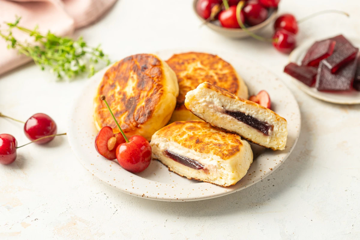 Интересный вариант творожных сырников, с сюрпризом внутри. Они хороши в любое время года, но особенно вкусны летом с сезонными ягодами — например, со спелой черешней. И, конечно, для этого рецепта вы можете использовать любой мармелад.