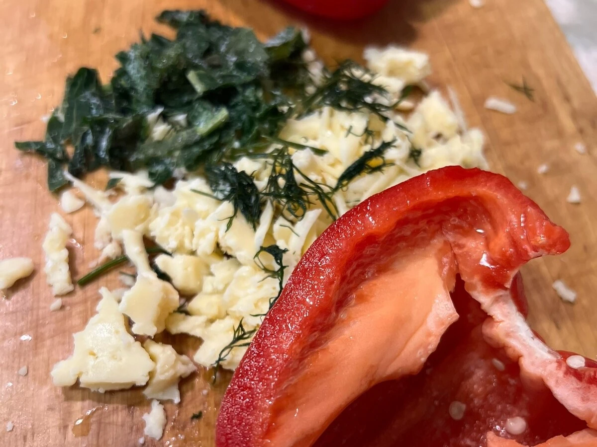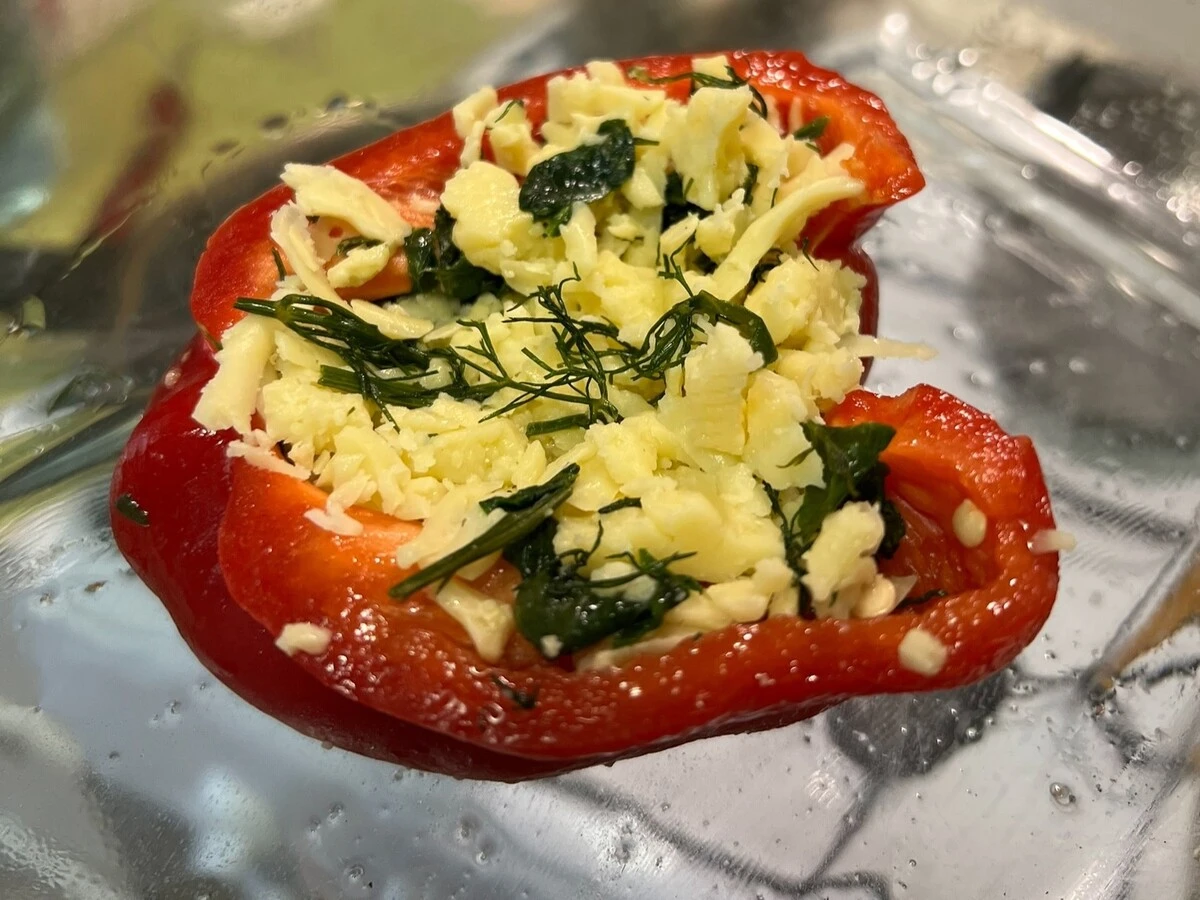Выложите сырную начинку в половинки перца.