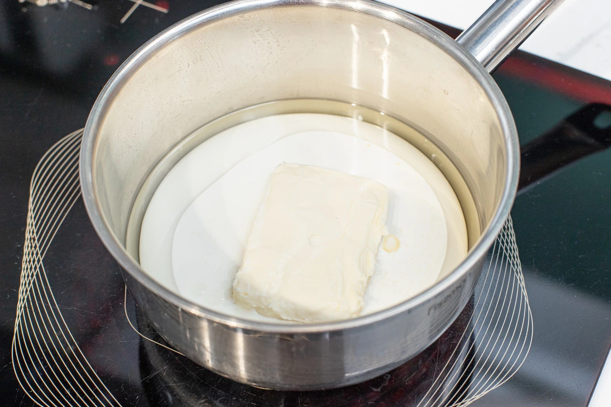 В ковш налейте растительное масло, сливки, положите плавленый сыр.