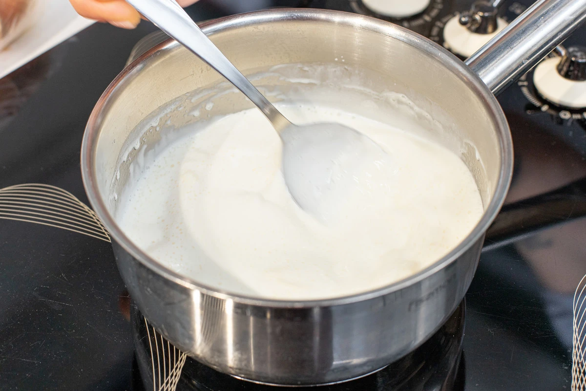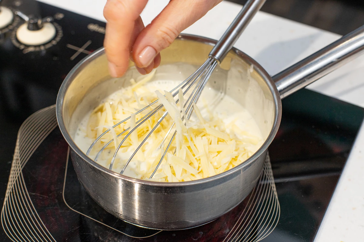 Нагревайте до 70-80 °C или пока не появится пар над ковшом. Перемешайте, снимите с огня и дайте сыру окончательно растаять.