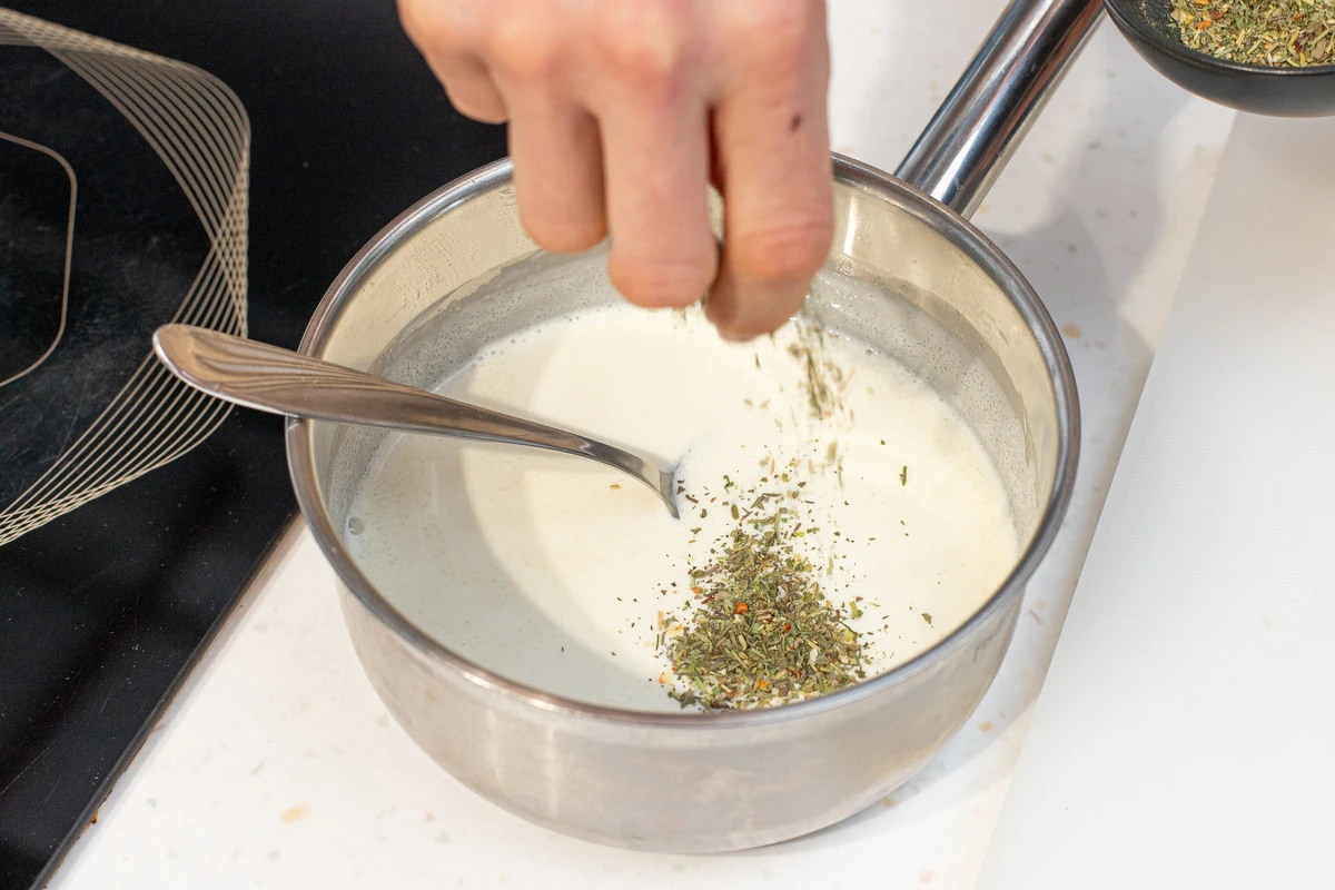 Всыпьте в соус итальянские травы, перемешайте венчиком до однородности.