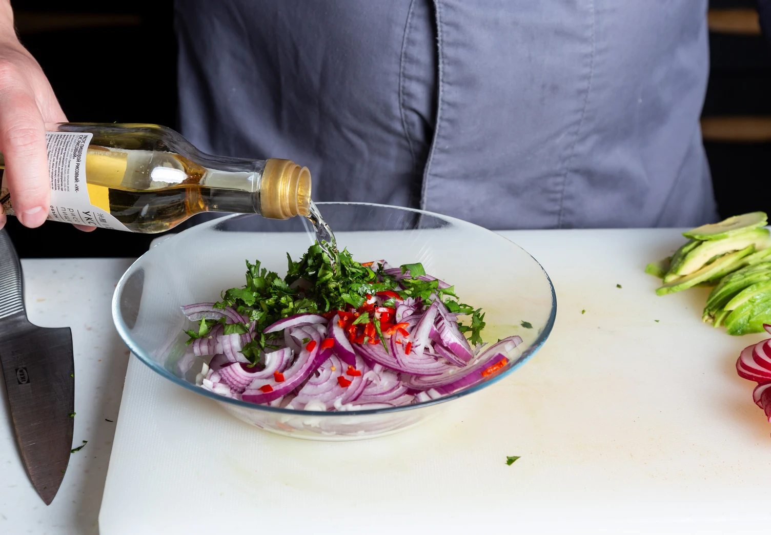 Замаринуйте красный лук в специях, уксусе и масле с рубленой кинзой.