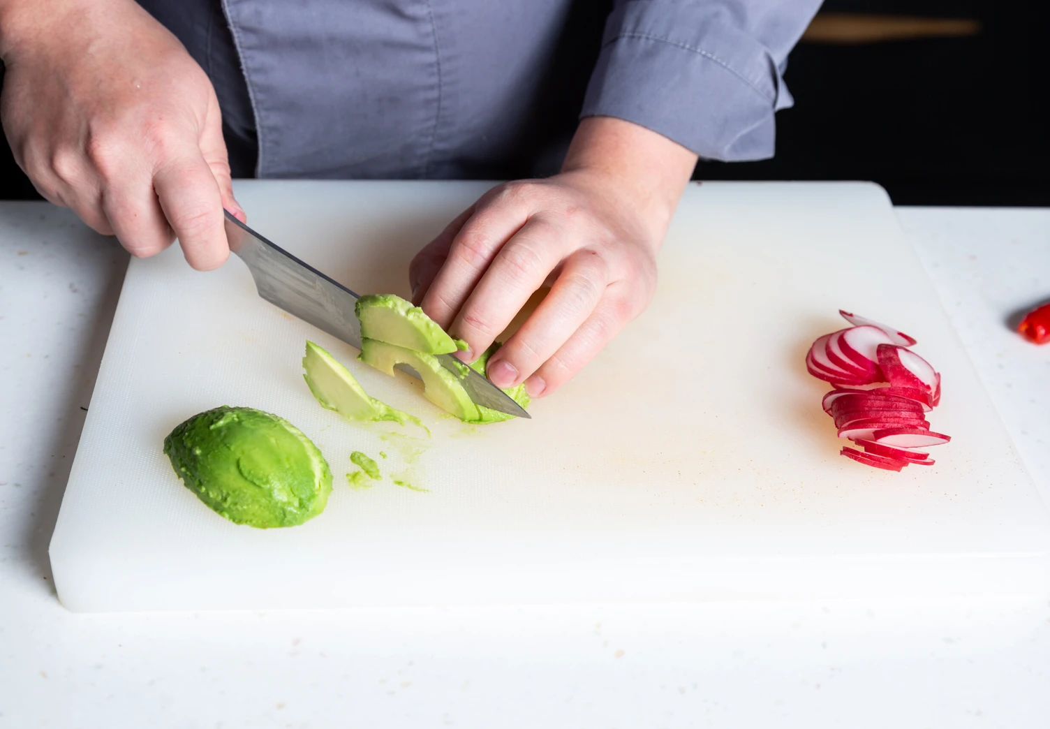 Романо крупно порубите, авокадо нарежьте дольками, редис — тонкими кружками.