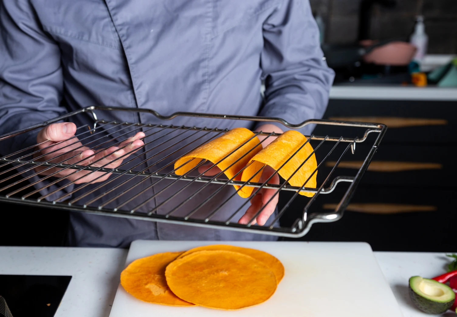 Подсушите тортильи, развесив их на решётке духовки и поставив выпекаться при 200°C на 1-2 минуты.
