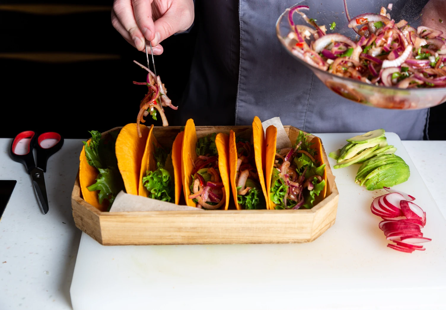 Мексиканская классика с пикантной начинкой из овощей и нежнейшими говяжьими щечками. Есть такос нужно сразу, чтобы хрустящие лепешки не размокли от соков и соусов.