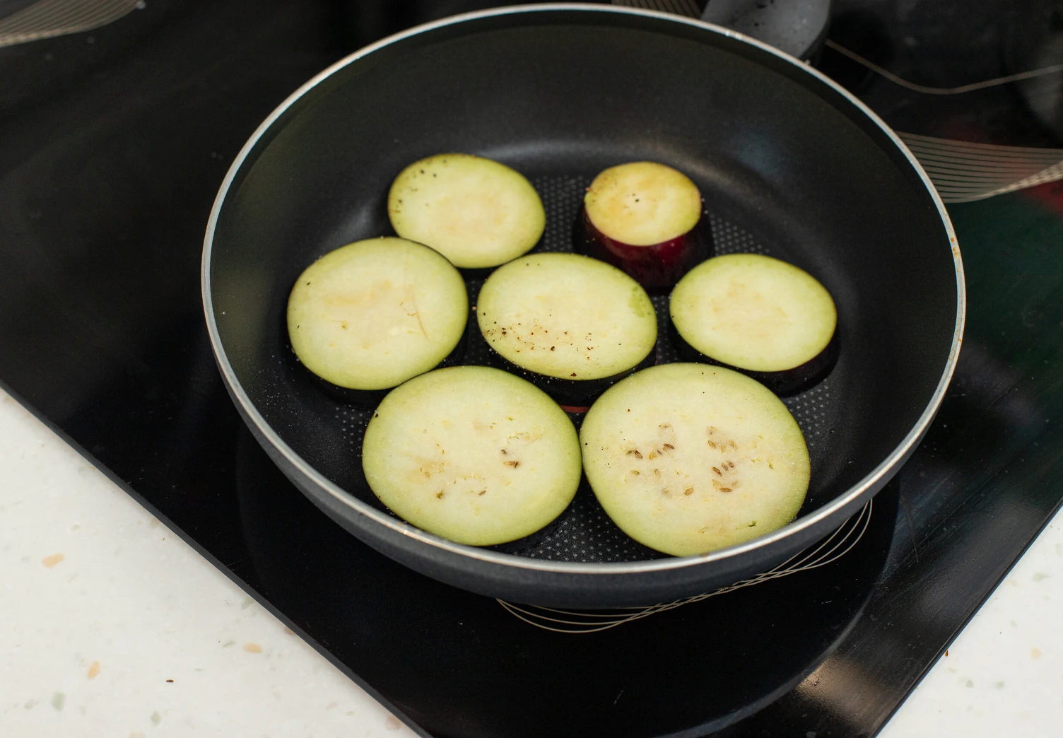 Баклажан нарежьте кружками толщиной примерно 8–10 мм. Посолите и поперчите по вкусу. Обжарьте овощ до золотистого цвета на хорошо разогретой сковороде с растительными маслом.