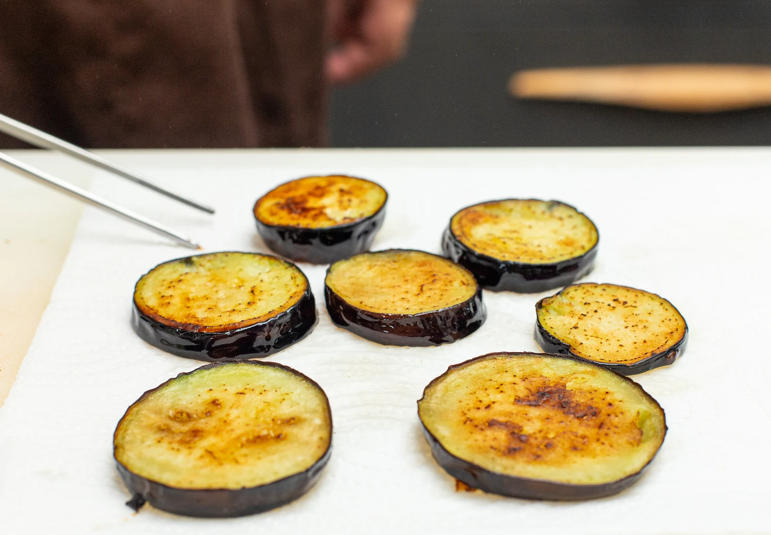 Готовые баклажаны выложите на бумажное полотенце, чтобы убрать лишний жир.