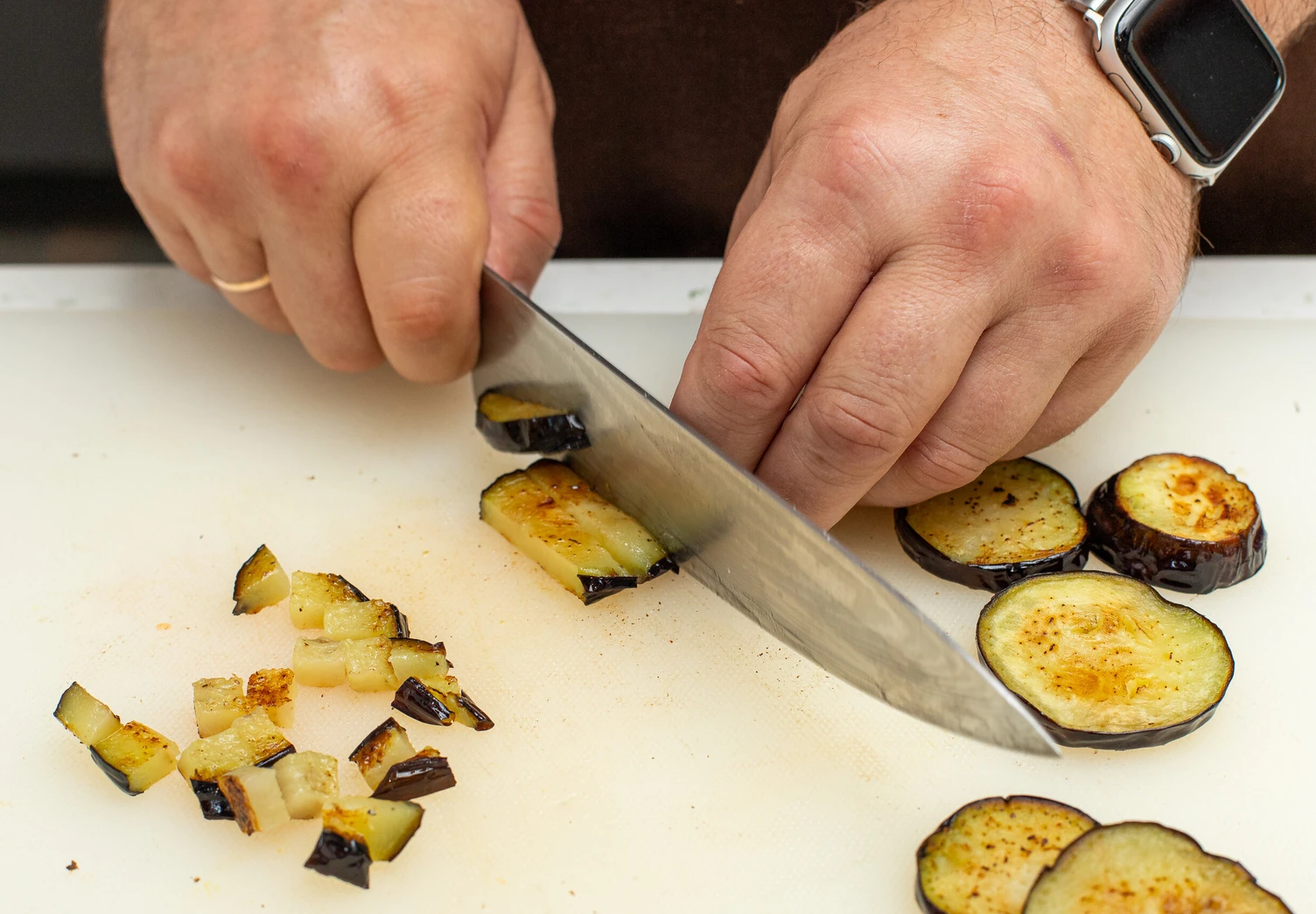 Нарежьте остывшие баклажаны средним кубиком.