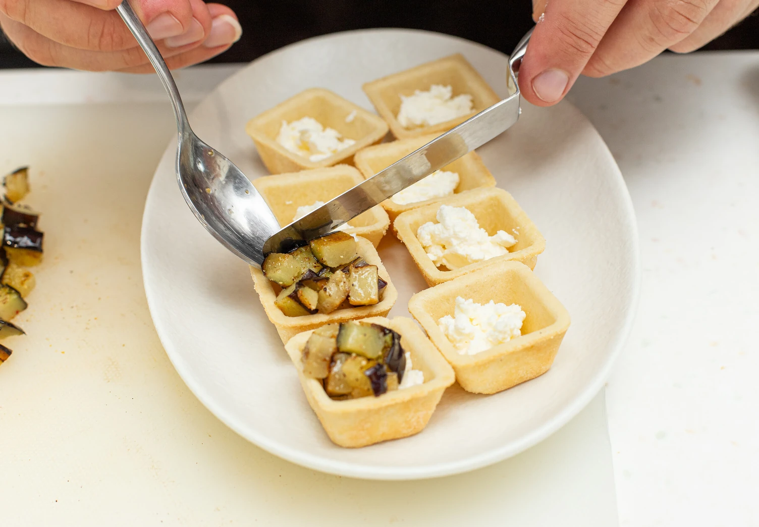Выложите в каждую тарталетку примерно по чайной ложке творожного сыра, затем баклажаны и немного соуса песто.