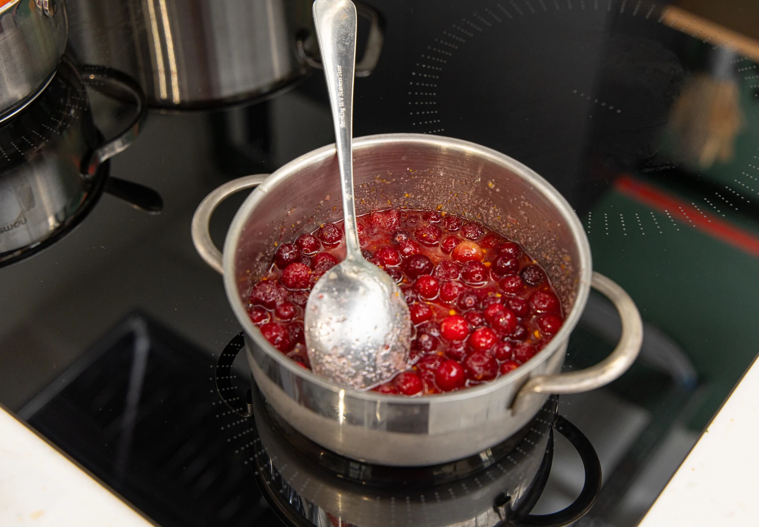 Поставьте на средний огонь и варите 8–10 минут, пока клюква не станет мягкой и не начнёт лопаться. Полностью охладите полученный соус.