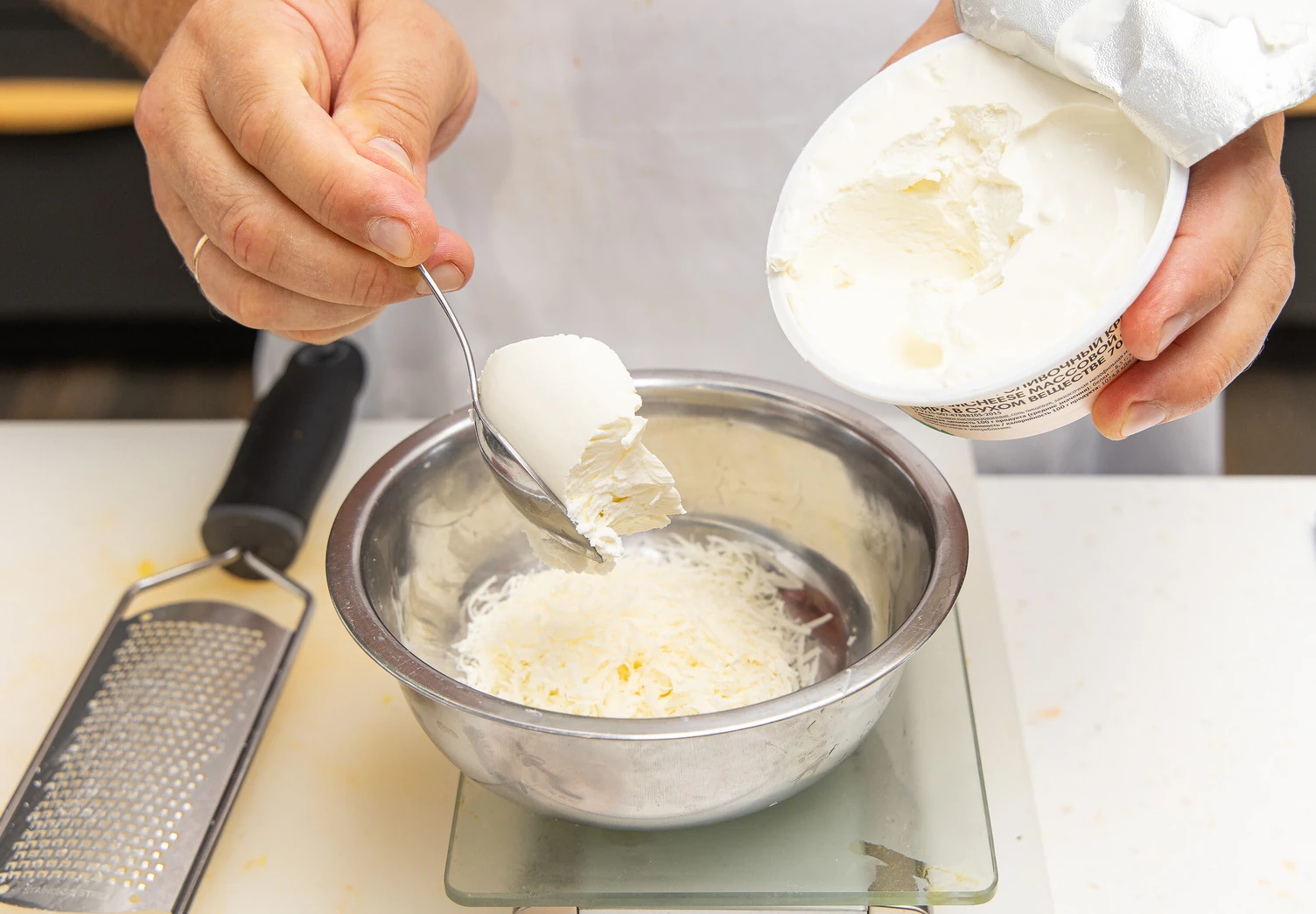 В большой миске силиконовой лопаткой смешайте сливочный сыр и тёртый на мелкой тёрке грюйер до получения однородной массы.