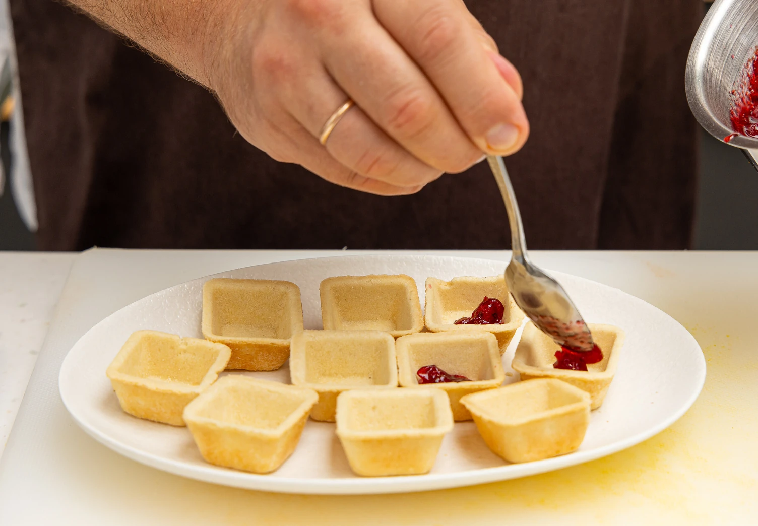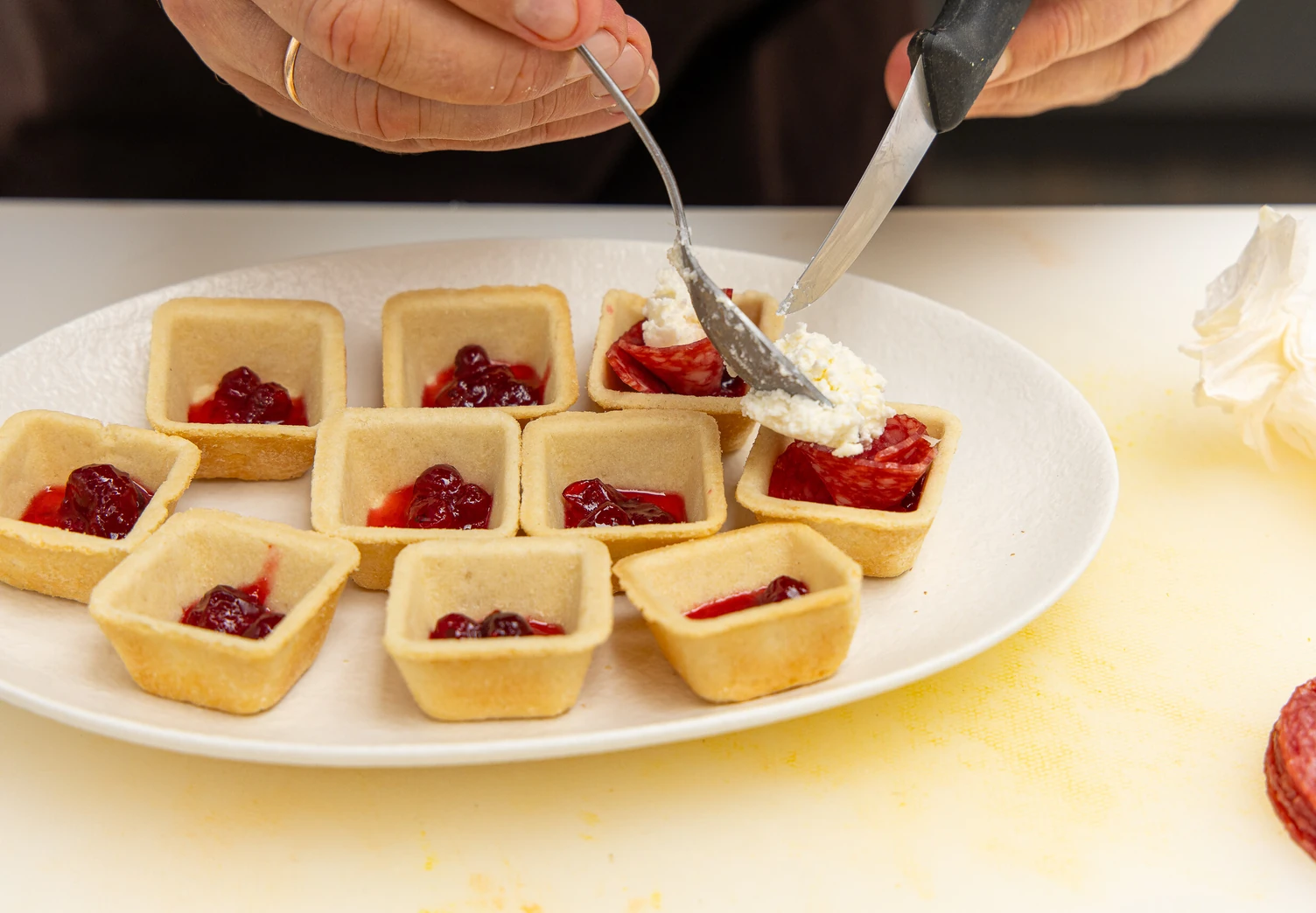 Выложите в каждую тарталетку примерно по 1 чайной ложке клюквенного соуса.