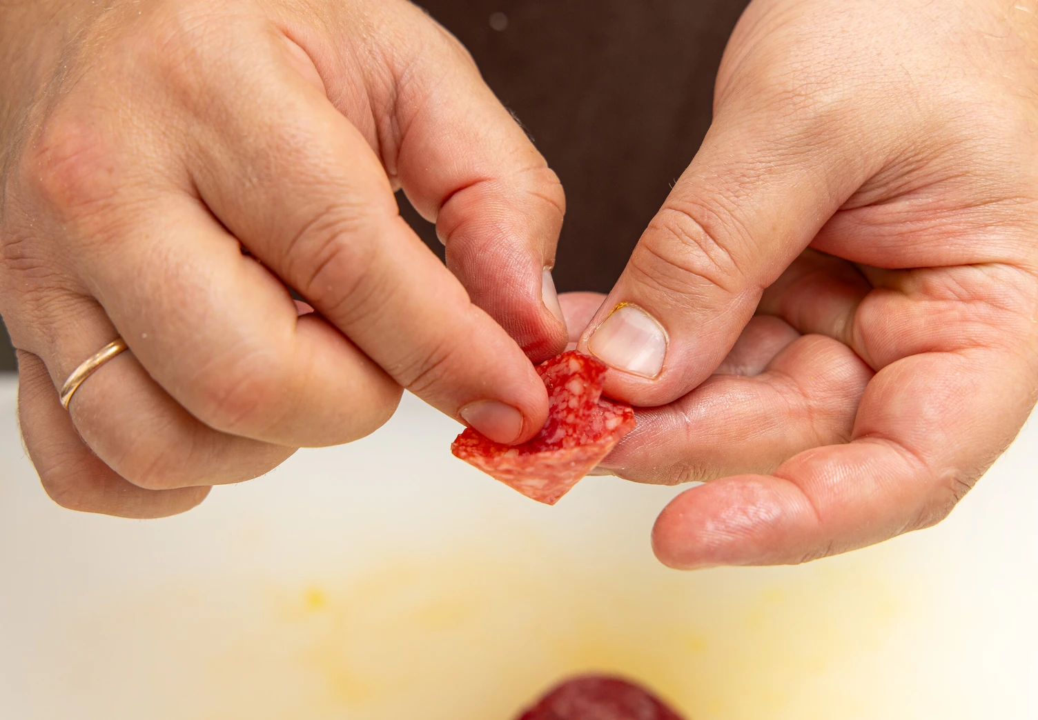 Ломтики салями сверните в небольшие кулёчки и выложите их на соус.