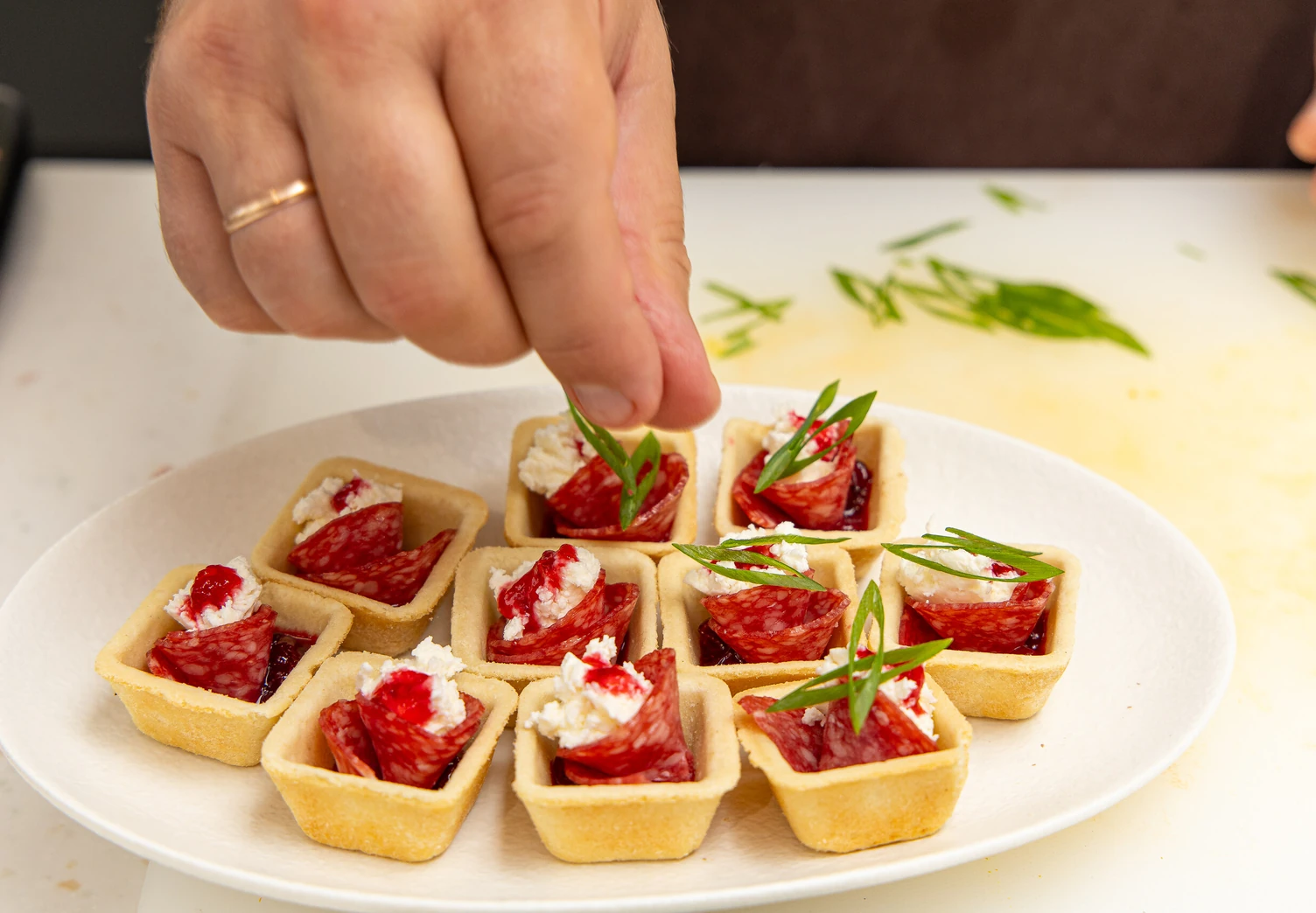 Перед подачей посыпьте тарталетки перьями нарезанного зелёного лука.