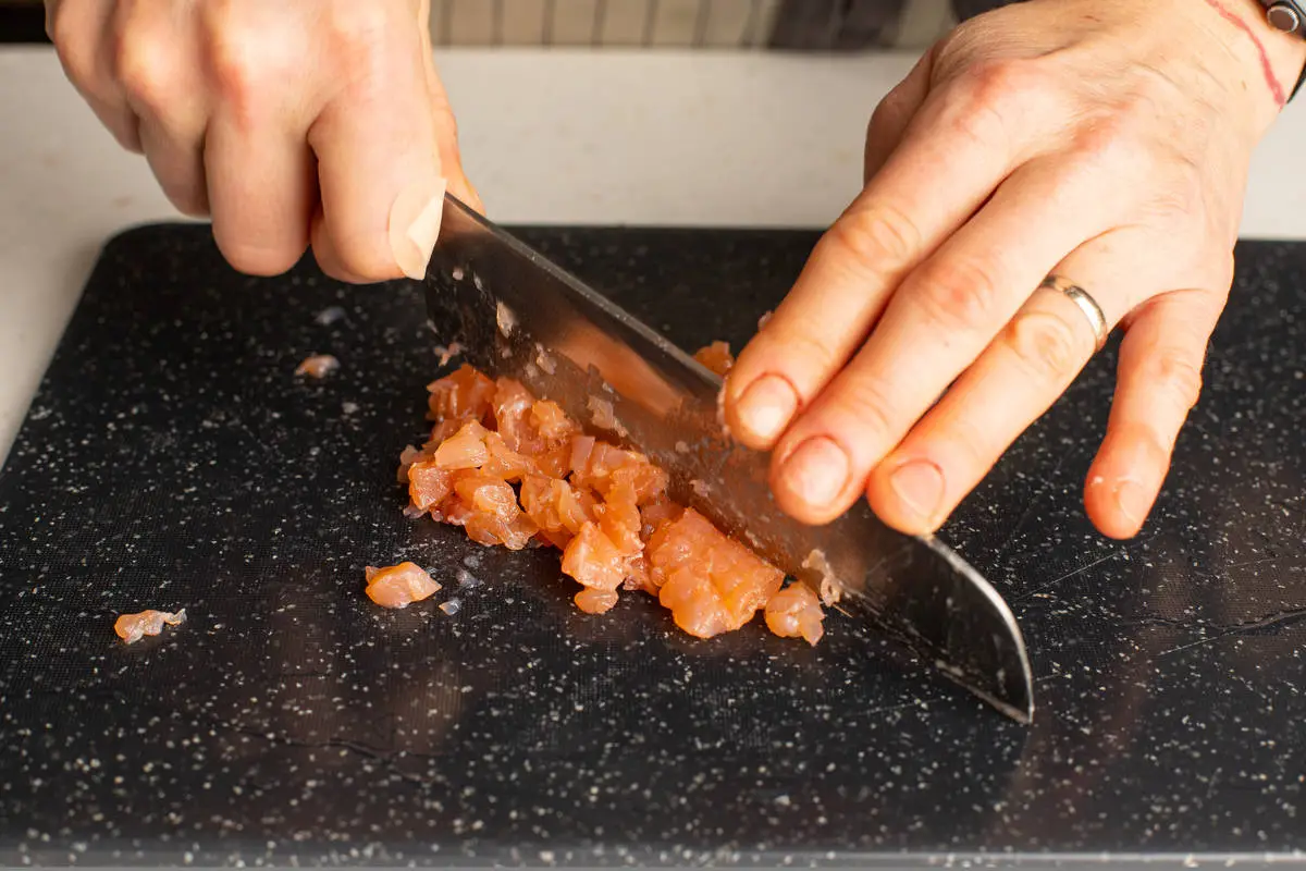 Рыбу нарежьте мелкими кубиками. Укроп измельчите, оставьте чуть-чуть для украшения.