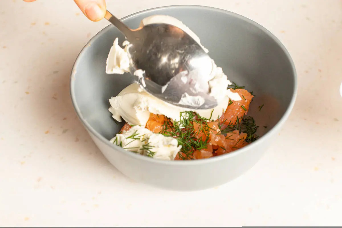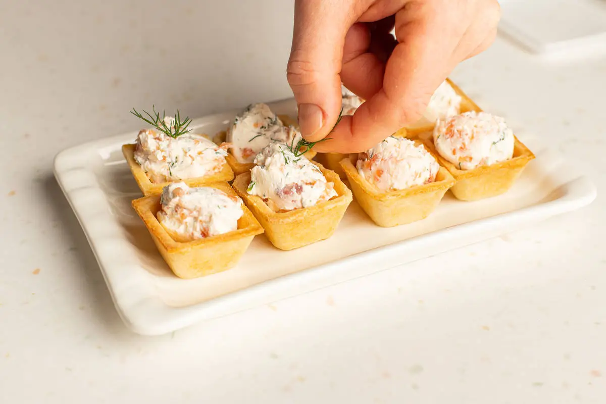 Иногда проще — значит лучше. Всего три идеально сочетающихся ингредиента: красная рыба, нежный сыр и чуть-чуть укропа. Если хочется максимально праздничной подачи, можно украсить тарталетки красной икрой.