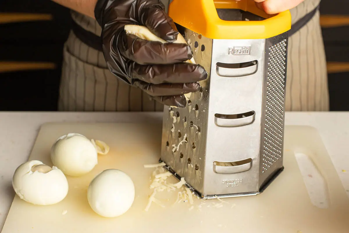 Яйца сварите вкрутую, остудите и очистите от скорлупы. Яйца и сыр измельчите на тёрке.