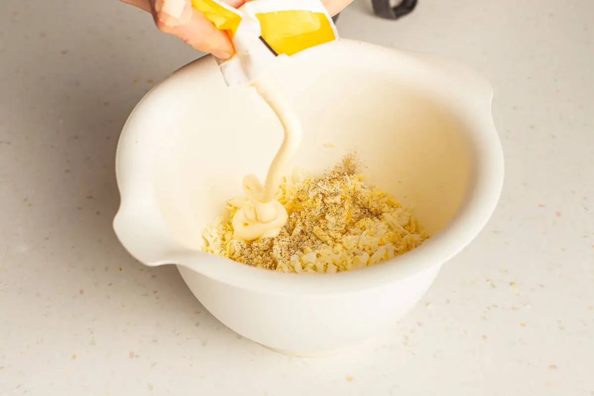Добавьте майонез и молотый перец. Пропустите через пресс зубчик чеснока, всё перемешайте. Досолите, если нужно.