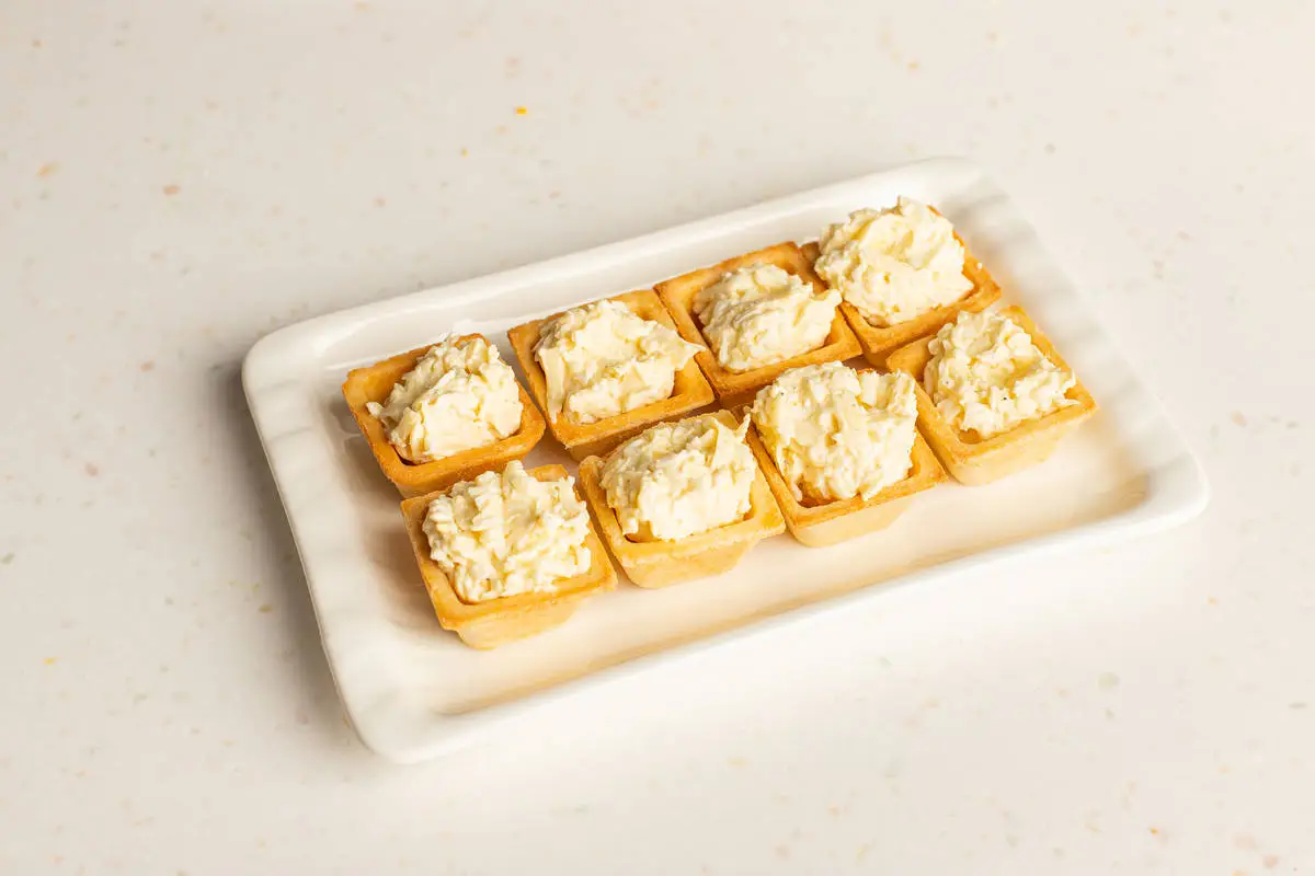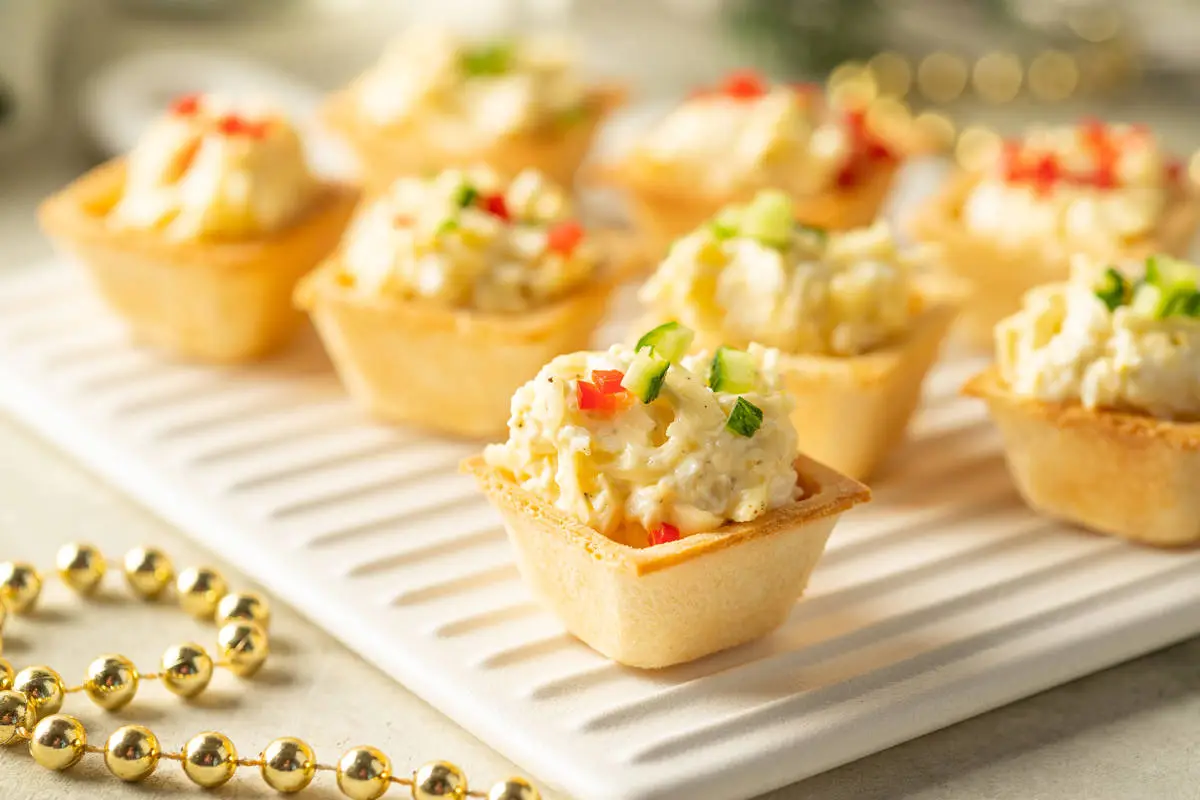 Наше прочтение яичного салата в порционной подаче. А на праздничном столе такие тарталетки выглядят нескучно благодаря ярким овощам.
