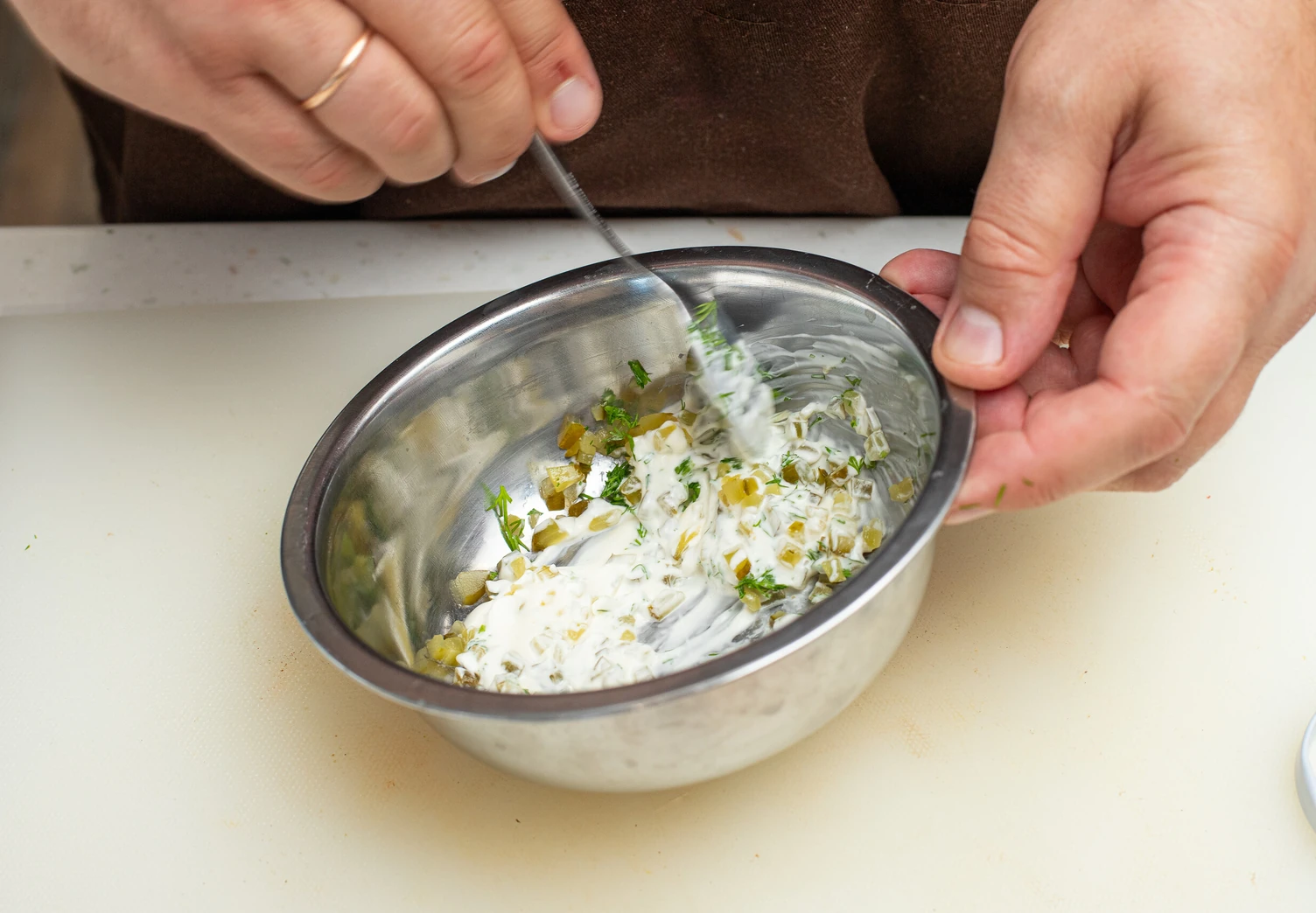 Для соуса тартар огурцы и укроп мелко порубите и смешайте с майонезом.