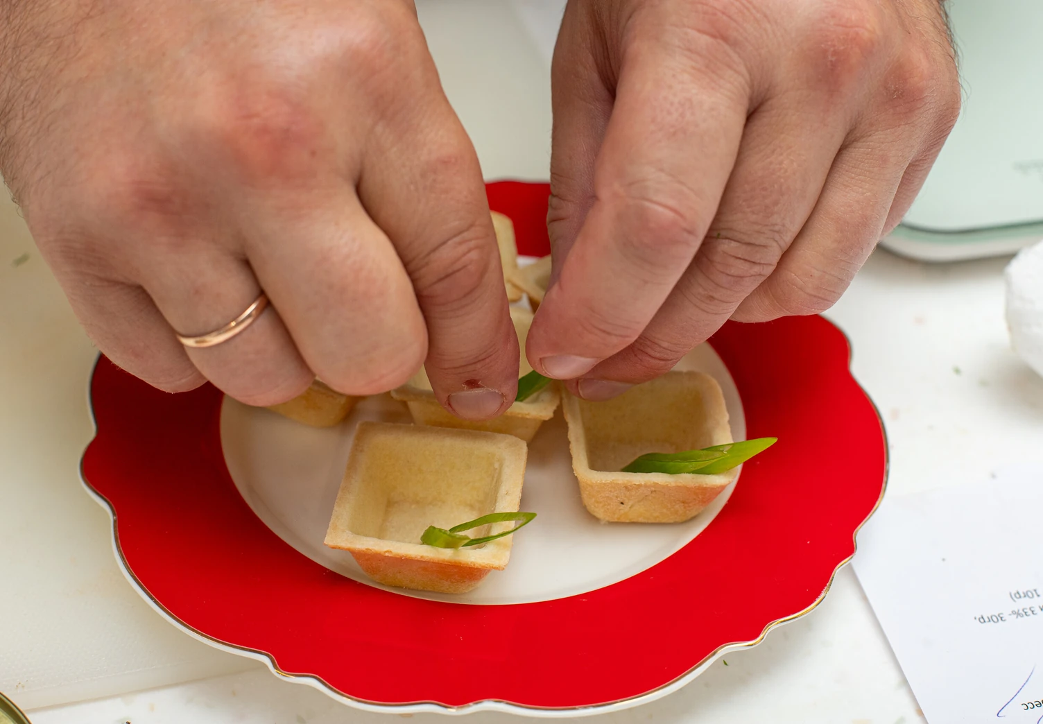 Зелёный лук нарежьте продолговатыми колечками и поместите по паре таких в каждую тарталетку.