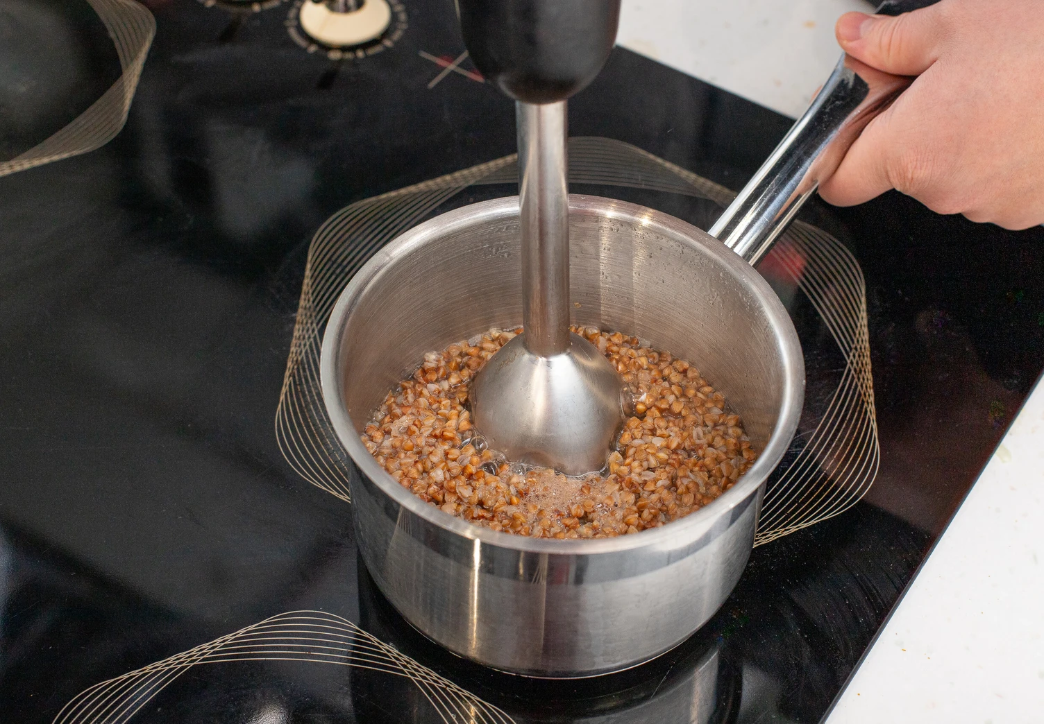 Протрите готовую гречку через сито или измельчите блендером до однородной массы.