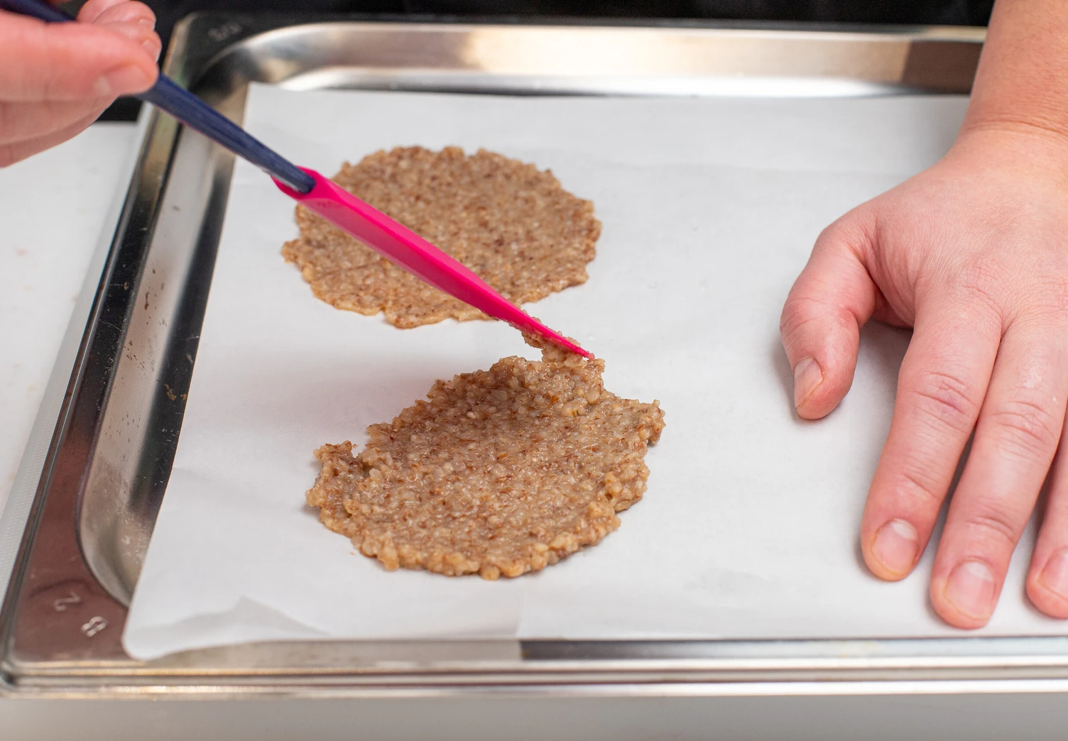 Размажьте полученную массу тонким слоем на противне, застеленном пергаментом.