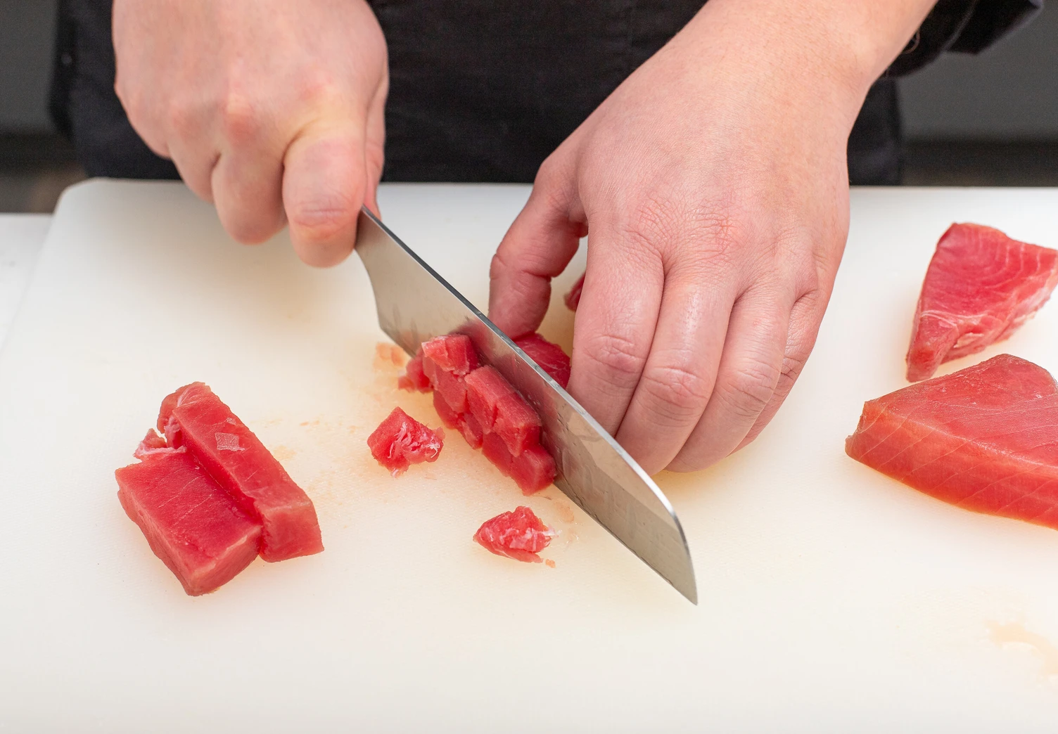 Тунец часто называют морской говядиной за плотную текстуру и высокое содержание белка и железа. Он особенно хорош в сыром и полусыром виде, поэтому мы решили приготовить из тунца тартар. Если не хотите тратить время на гречневые чипсы, блюдо можно подать с тонкими тостами из бородинского хлеба — получится не менее вкусно.
