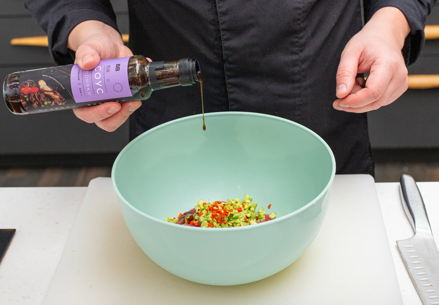 Смешайте тунца с авокадо и добавьте все подготовленные специи, масла и соусы.